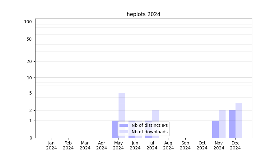 Number of downloads for software package heplots, year by year, from 2025 back to 2014 (years with no downloads are omitted):