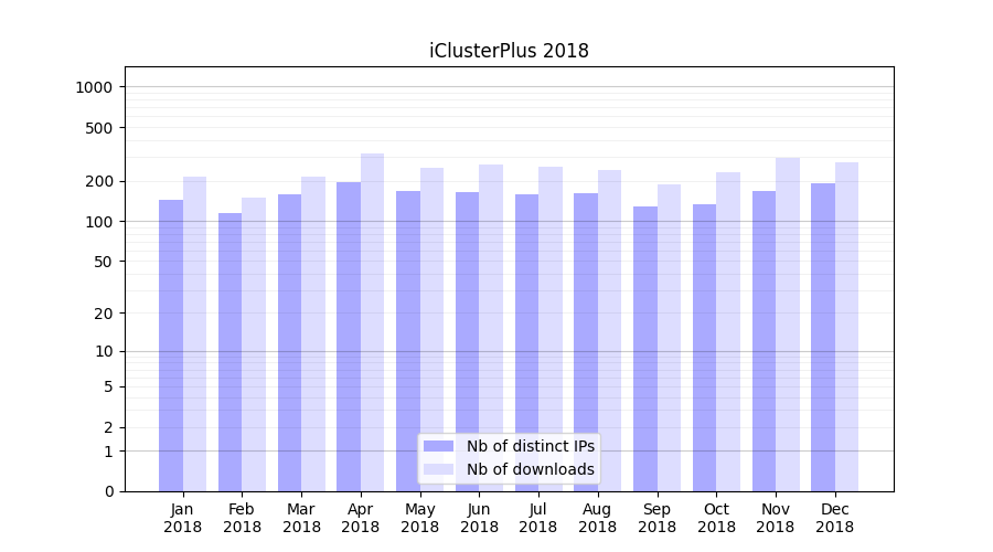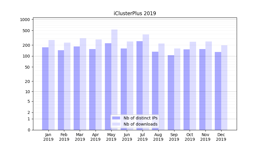 Number of downloads for software package iClusterPlus, year by year, from 2025 back to 2014 (years with no downloads are omitted):