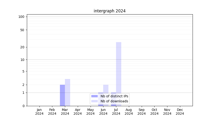 Number of downloads for software package intergraph, year by year, from 2025 back to 2014 (years with no downloads are omitted):