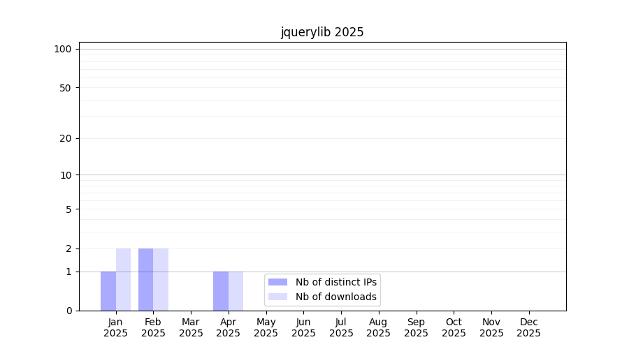 Number of downloads for software package jquerylib, year by year, from 2025 back to 2014 (years with no downloads are omitted):