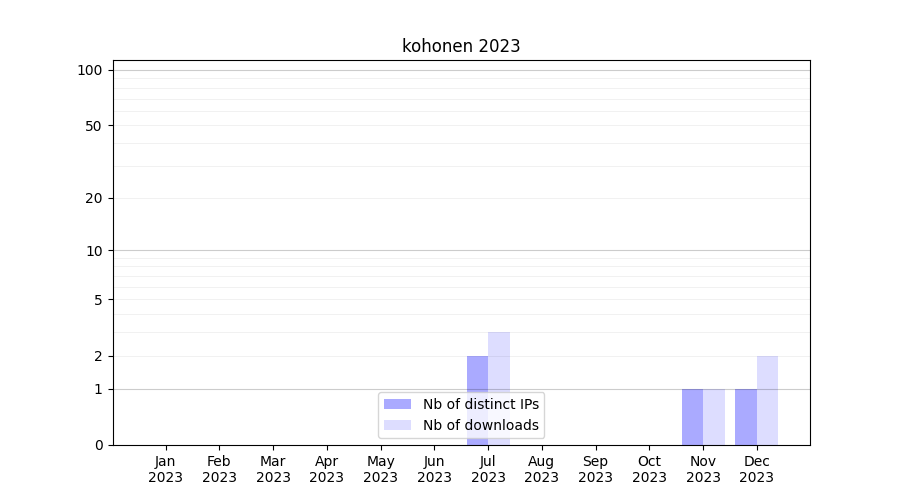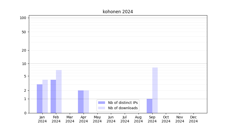 Number of downloads for software package kohonen, year by year, from 2025 back to 2014 (years with no downloads are omitted):