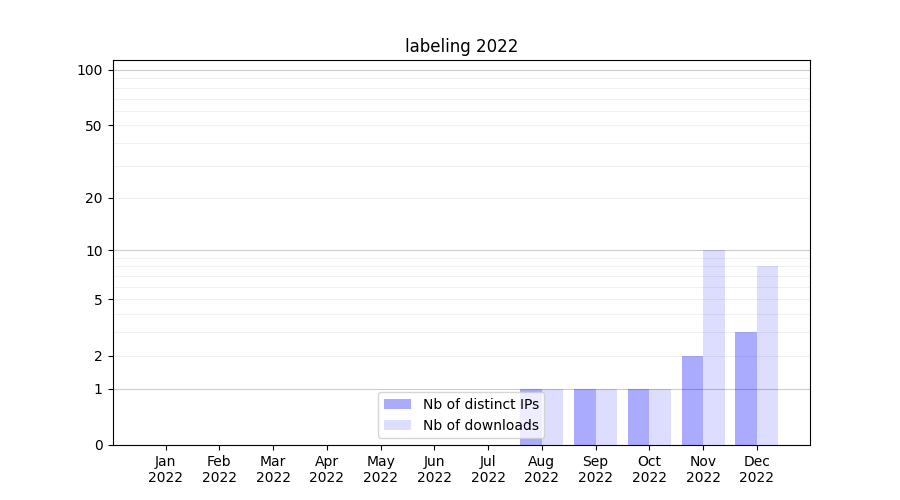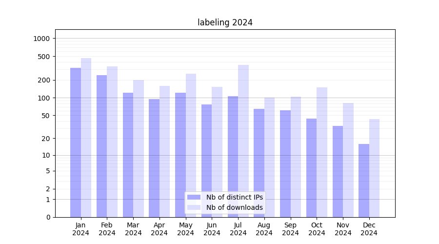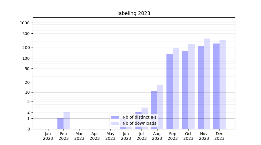 Number of downloads for software package labeling, year by year, from 2025 back to 2014 (years with no downloads are omitted):