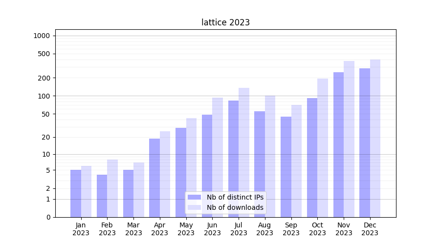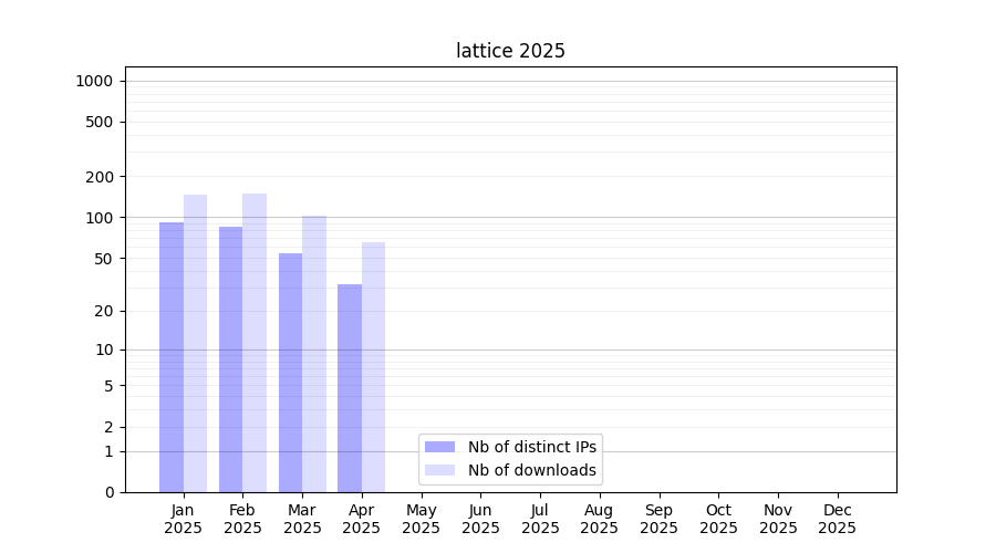 Number of downloads for software package lattice, year by year, from 2025 back to 2014 (years with no downloads are omitted):