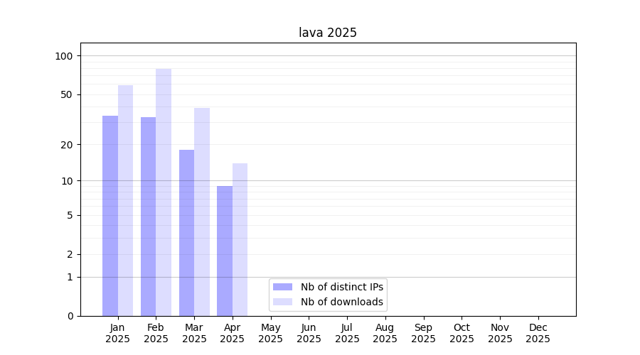 Number of downloads for software package lava, year by year, from 2025 back to 2014 (years with no downloads are omitted):
