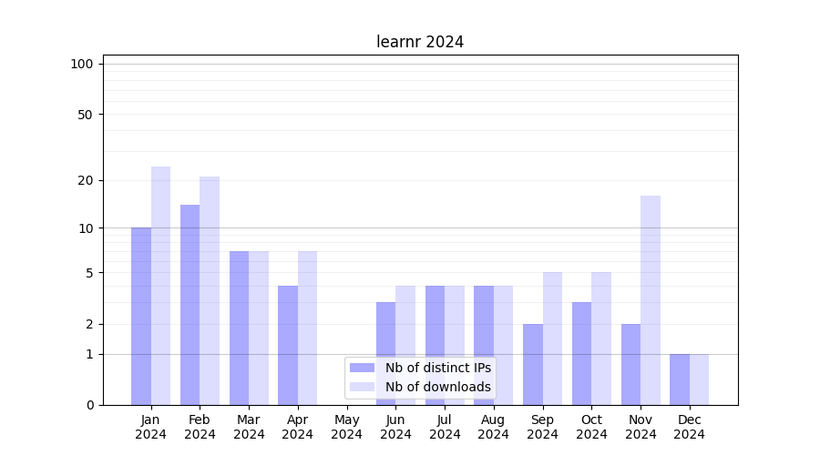 Number of downloads for software package learnr, year by year, from 2025 back to 2014 (years with no downloads are omitted):