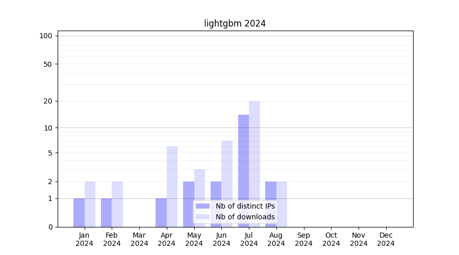 Number of downloads for software package lightgbm, year by year, from 2025 back to 2014 (years with no downloads are omitted):