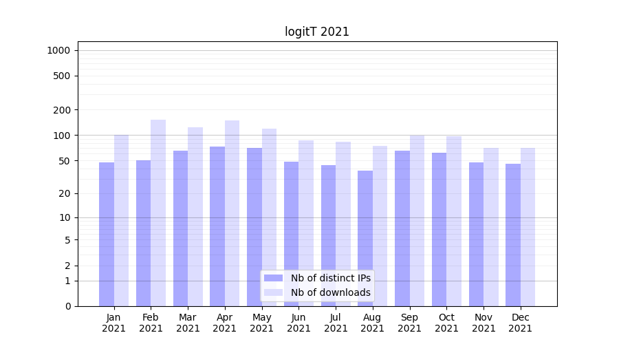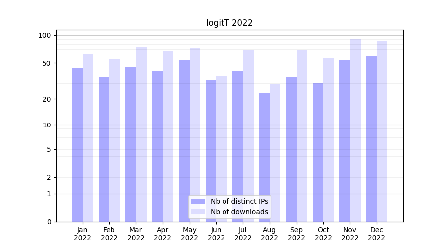 Number of downloads for software package logitT, year by year, from 2025 back to 2014 (years with no downloads are omitted):