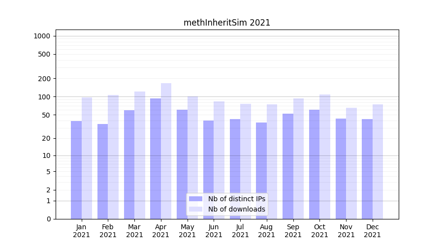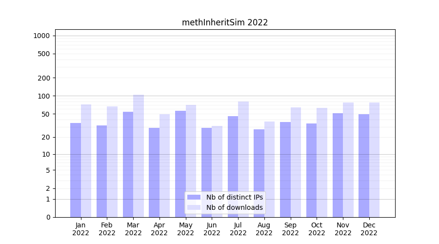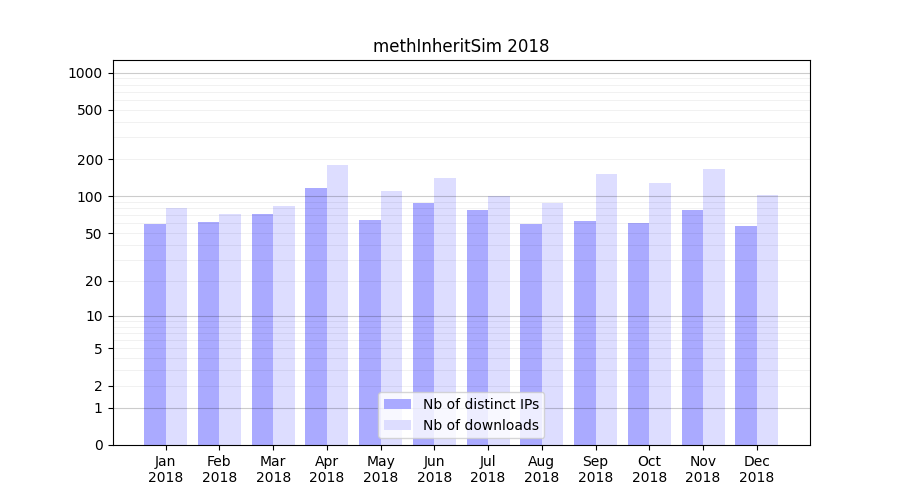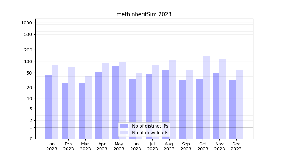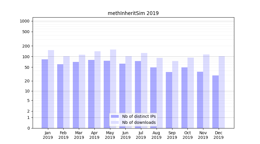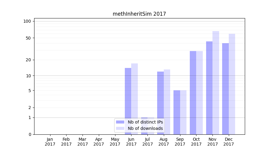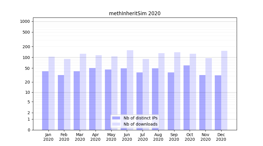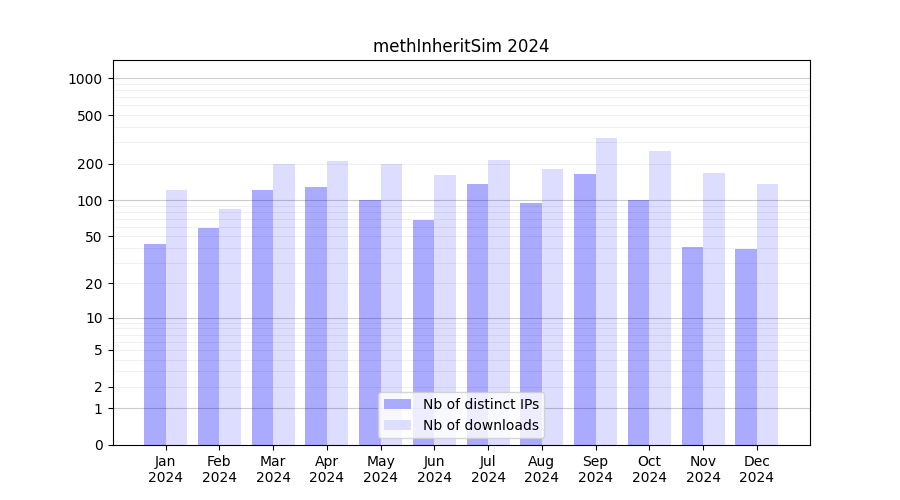Number of downloads for software package methInheritSim, year by year, from 2025 back to 2014 (years with no downloads are omitted):