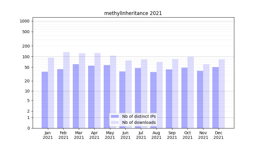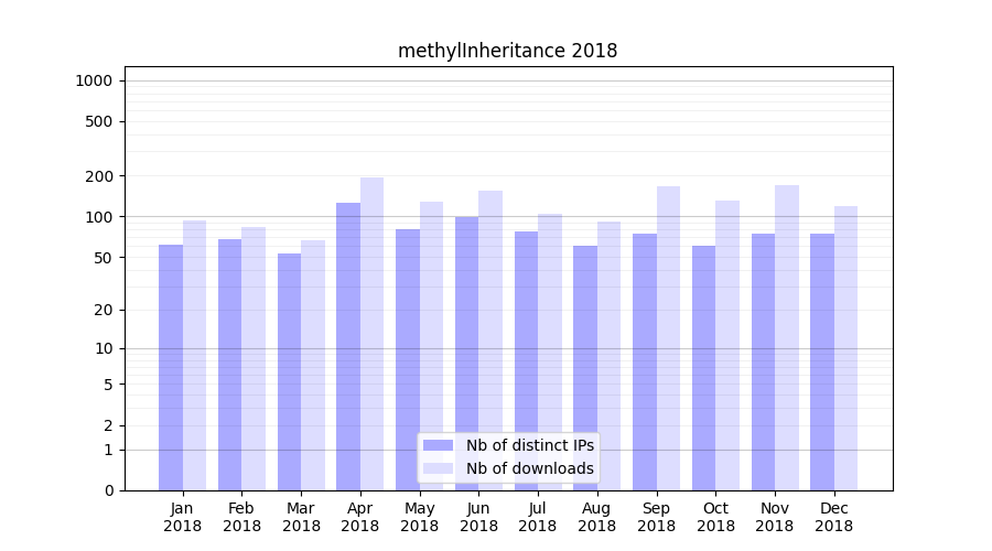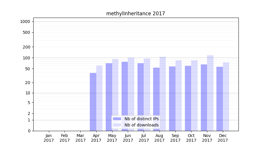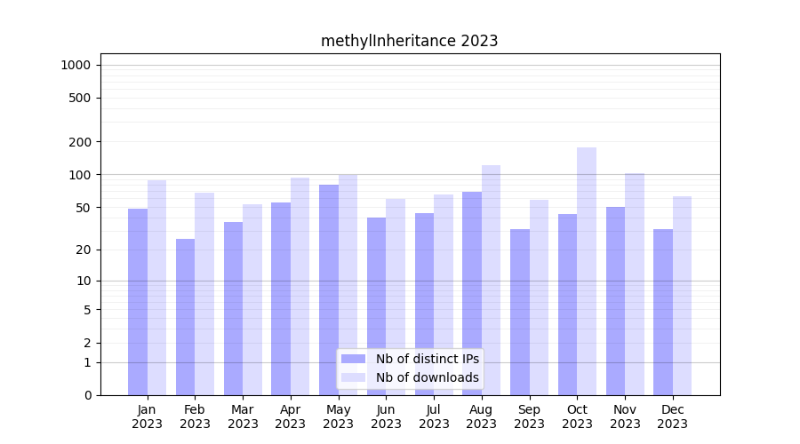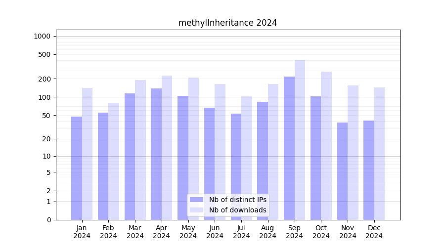 Number of downloads for software package methylInheritance, year by year, from 2025 back to 2014 (years with no downloads are omitted):