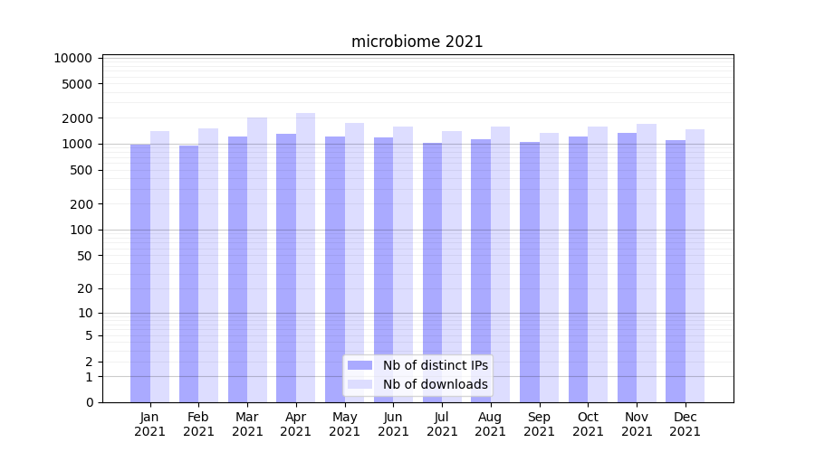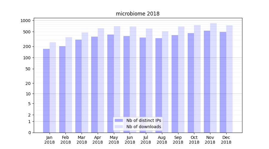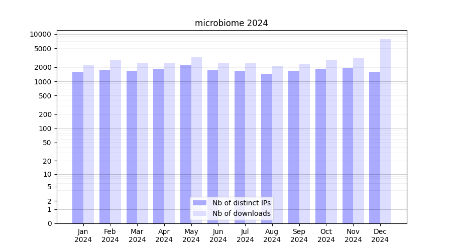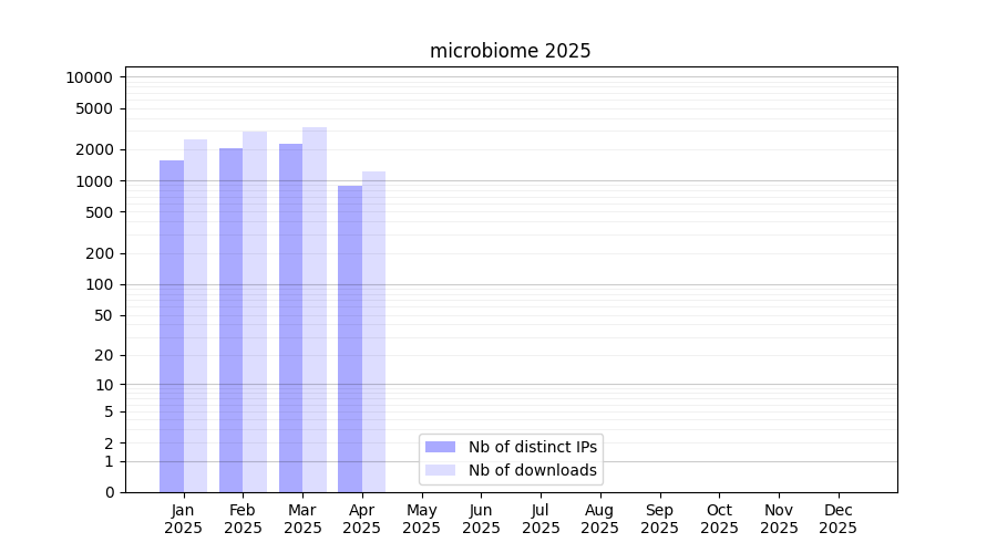 Number of downloads for software package microbiome, year by year, from 2025 back to 2014 (years with no downloads are omitted):