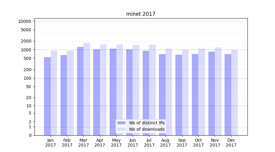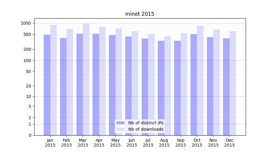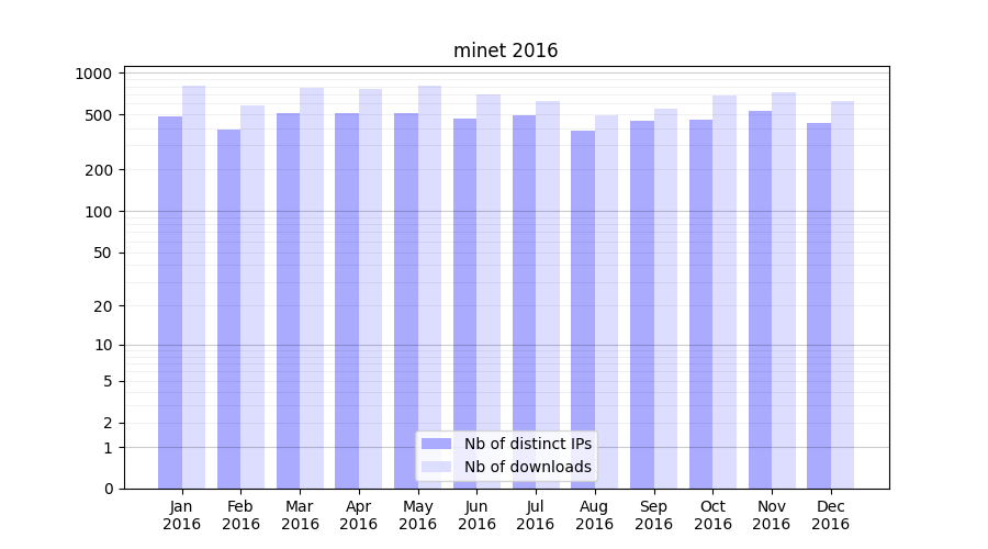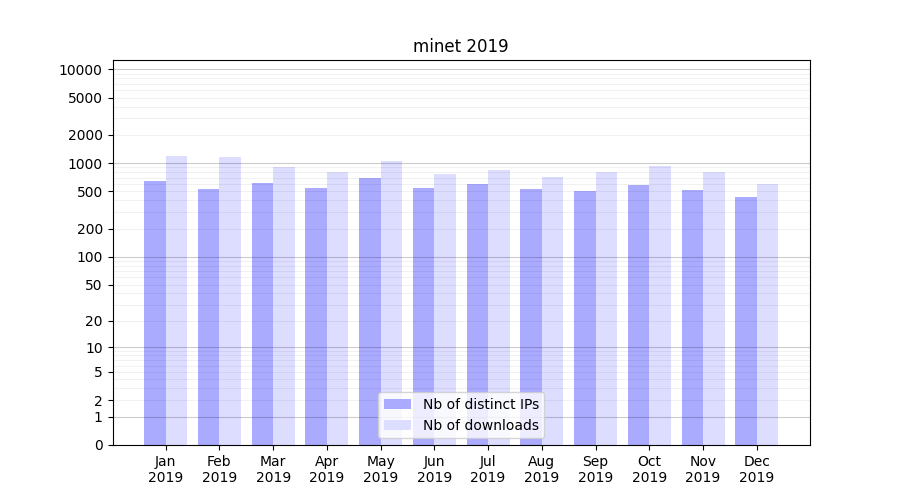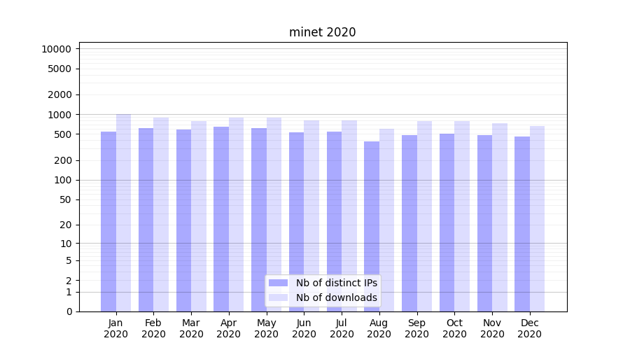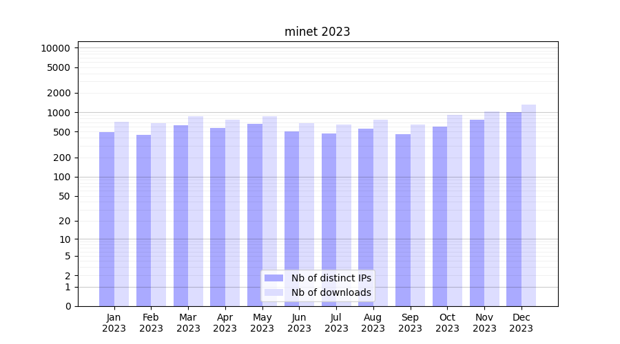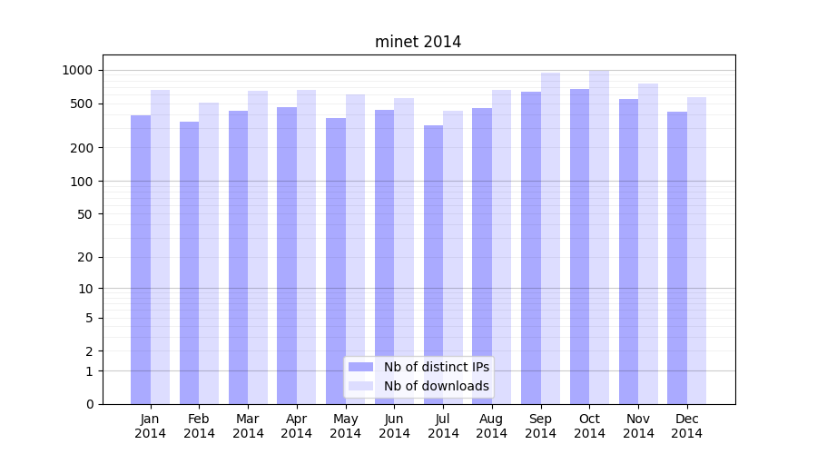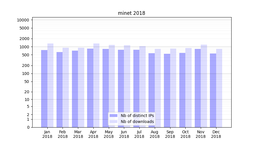 Number of downloads for software package minet, year by year, from 2025 back to 2014 (years with no downloads are omitted):