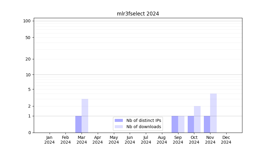 Number of downloads for software package mlr3fselect, year by year, from 2025 back to 2014 (years with no downloads are omitted):