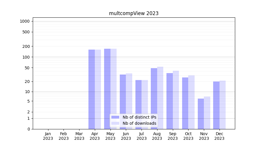 Number of downloads for software package multcompView, year by year, from 2025 back to 2014 (years with no downloads are omitted):