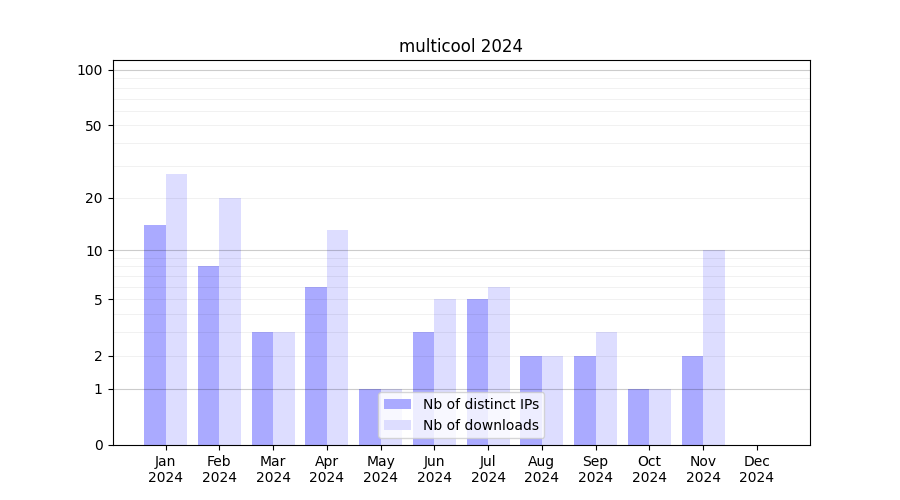 Number of downloads for software package multicool, year by year, from 2025 back to 2014 (years with no downloads are omitted):