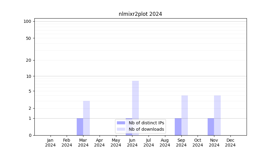 Number of downloads for software package nlmixr2plot, year by year, from 2025 back to 2014 (years with no downloads are omitted):
