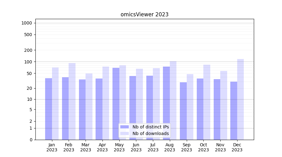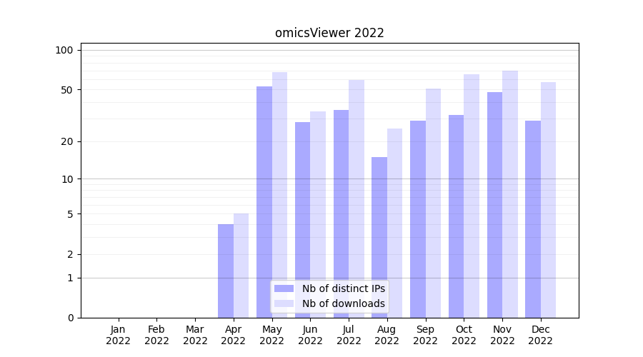 Number of downloads for software package omicsViewer, year by year, from 2025 back to 2014 (years with no downloads are omitted):