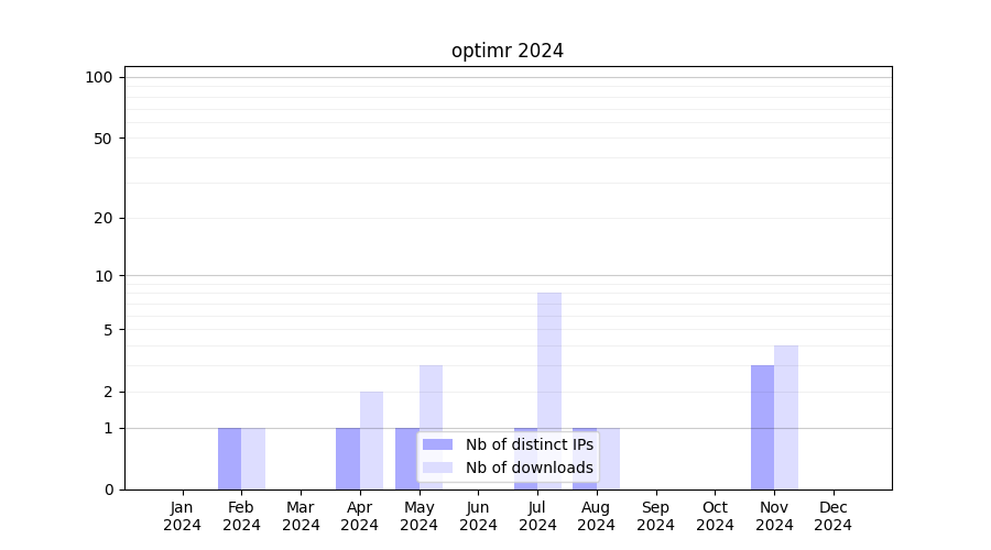 Number of downloads for software package optimr, year by year, from 2025 back to 2014 (years with no downloads are omitted):