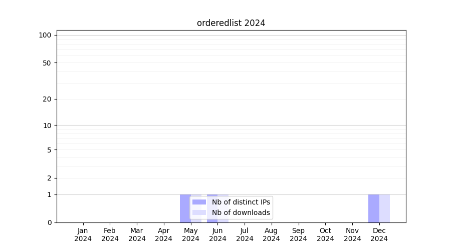 Number of downloads for software package orderedlist, year by year, from 2025 back to 2014 (years with no downloads are omitted):