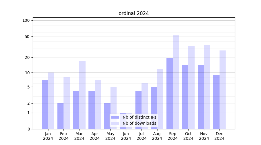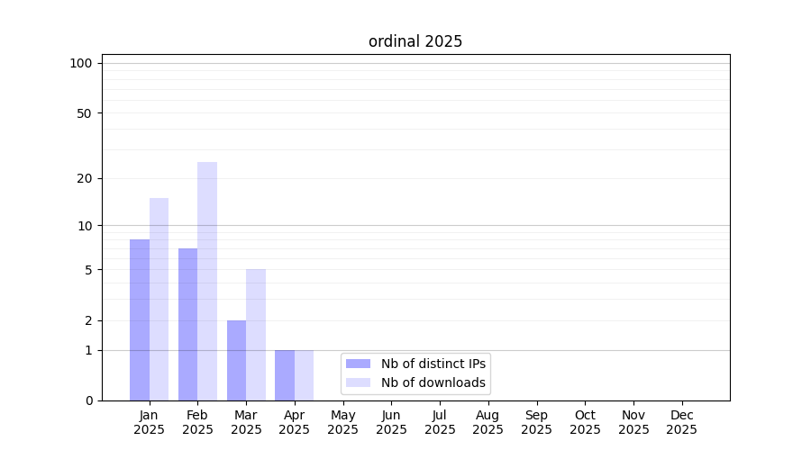 Number of downloads for software package ordinal, year by year, from 2025 back to 2014 (years with no downloads are omitted):