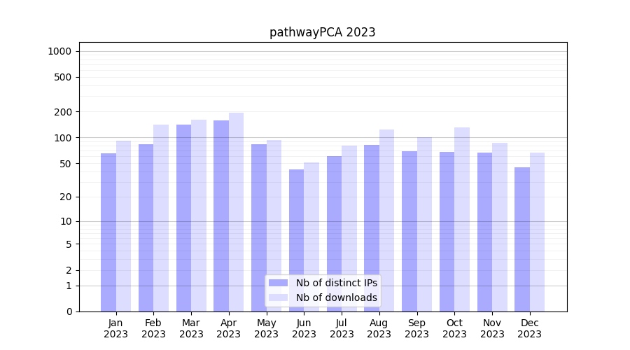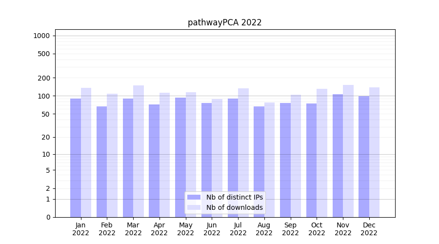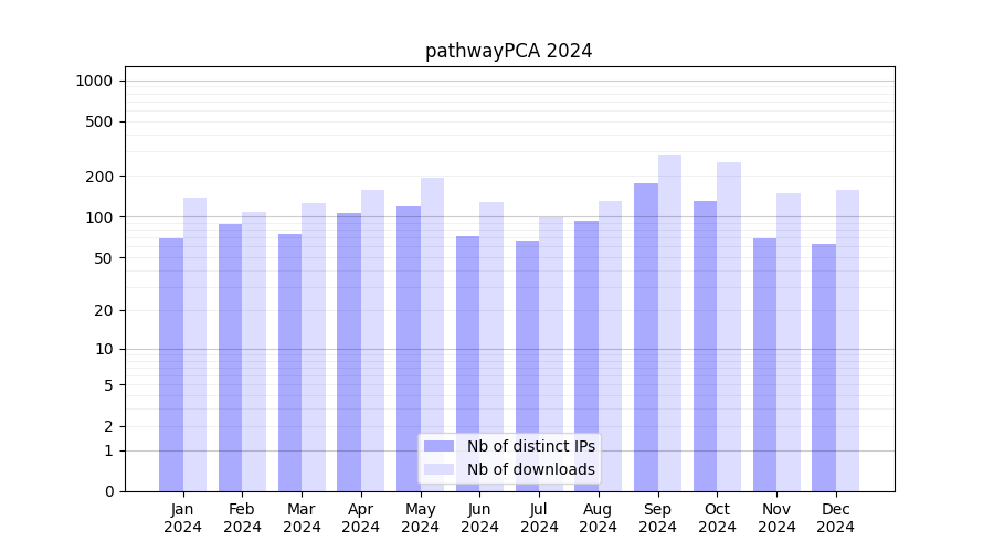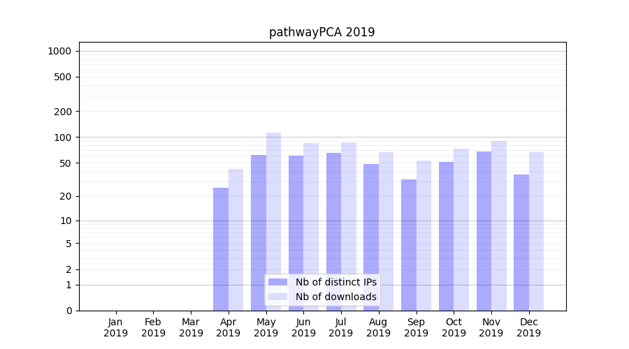 Number of downloads for software package pathwayPCA, year by year, from 2025 back to 2014 (years with no downloads are omitted):