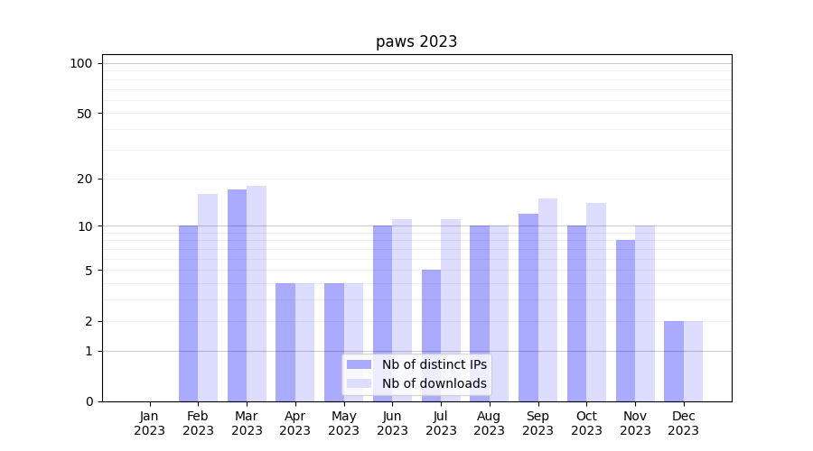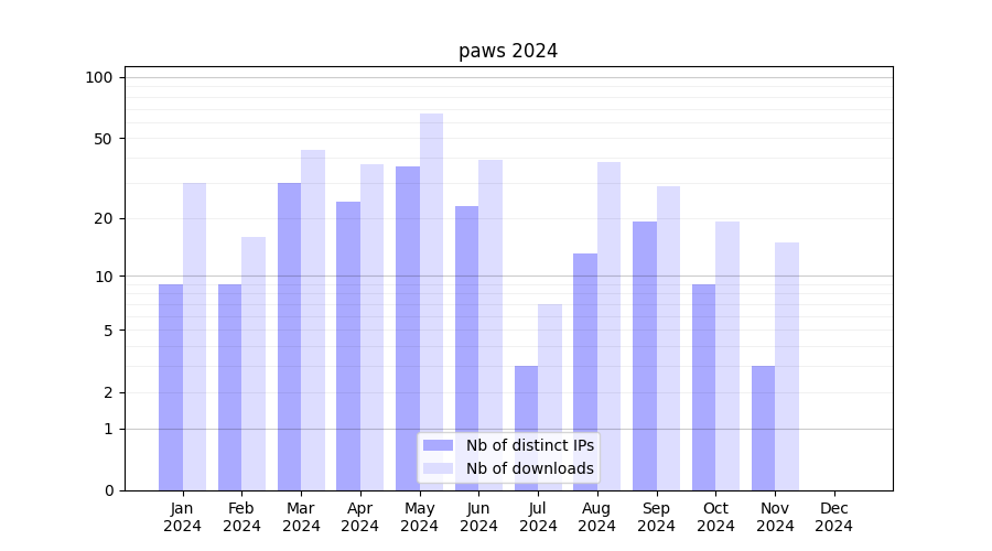 Number of downloads for software package paws, year by year, from 2025 back to 2014 (years with no downloads are omitted):