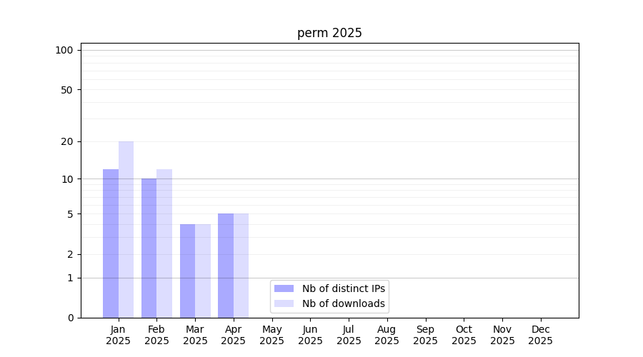 Number of downloads for software package perm, year by year, from 2025 back to 2014 (years with no downloads are omitted):