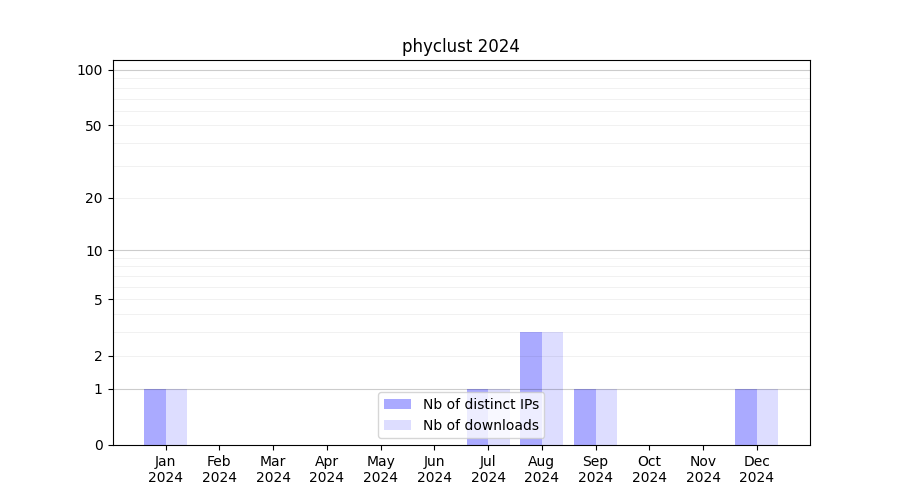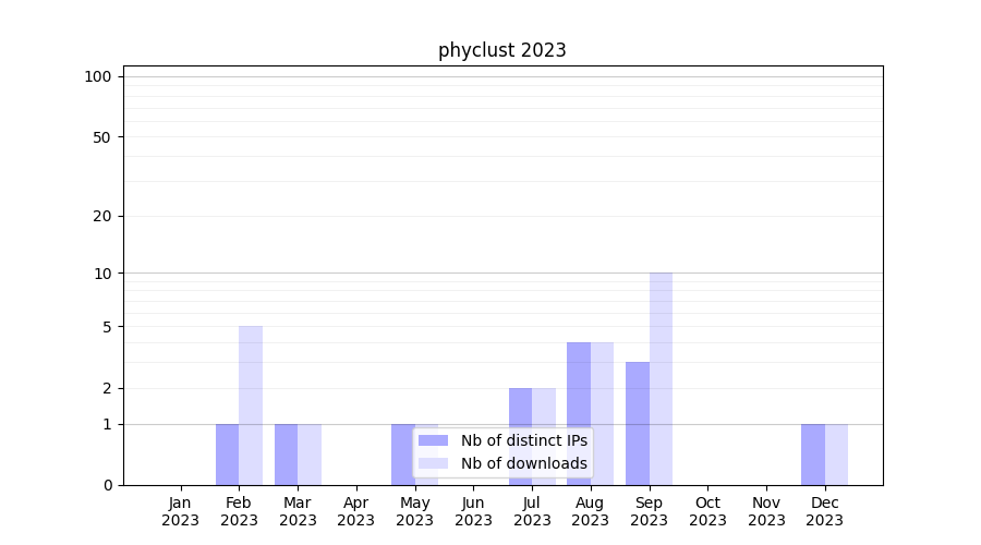 Number of downloads for software package phyclust, year by year, from 2025 back to 2014 (years with no downloads are omitted):