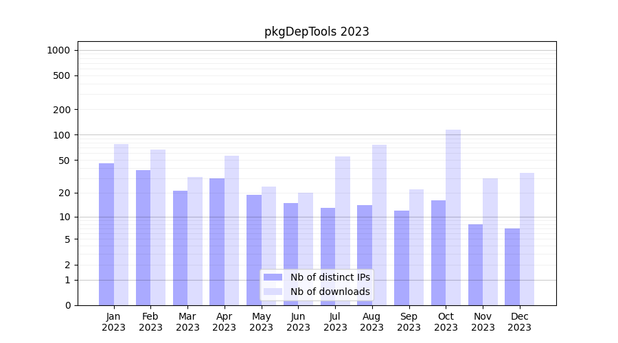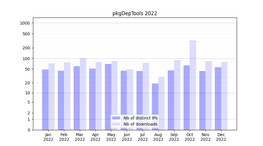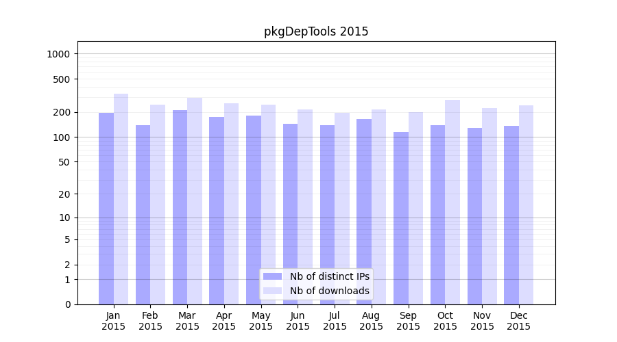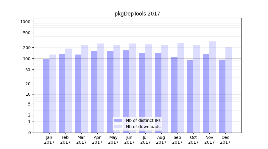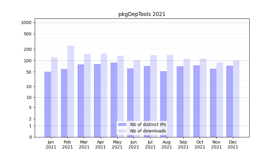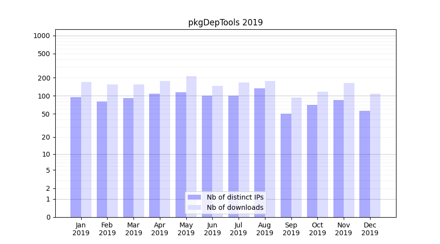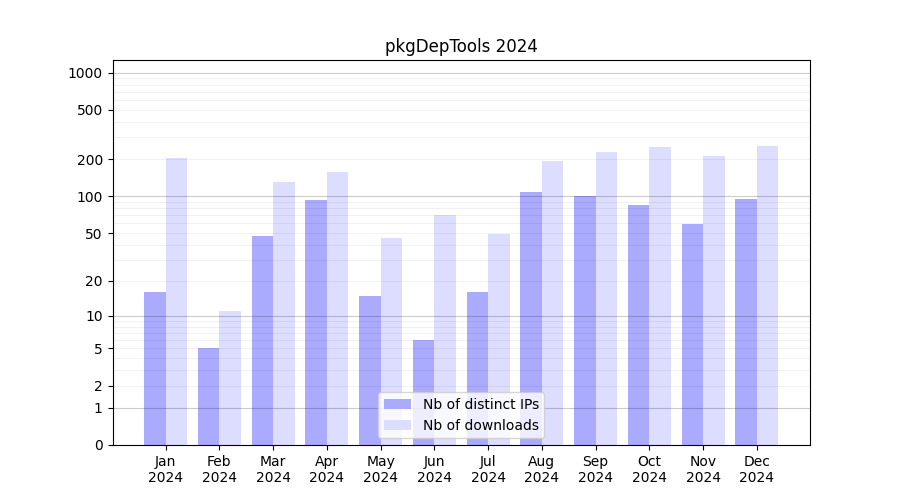Number of downloads for software package pkgDepTools, year by year, from 2025 back to 2014 (years with no downloads are omitted):