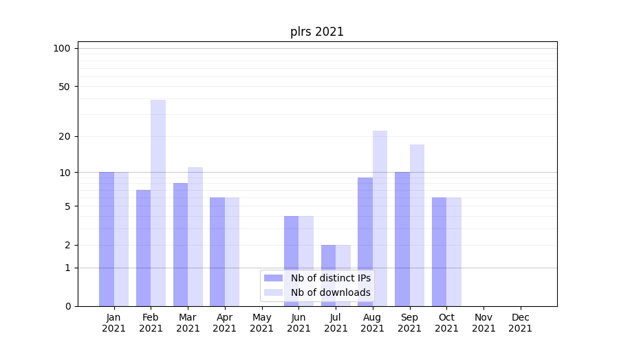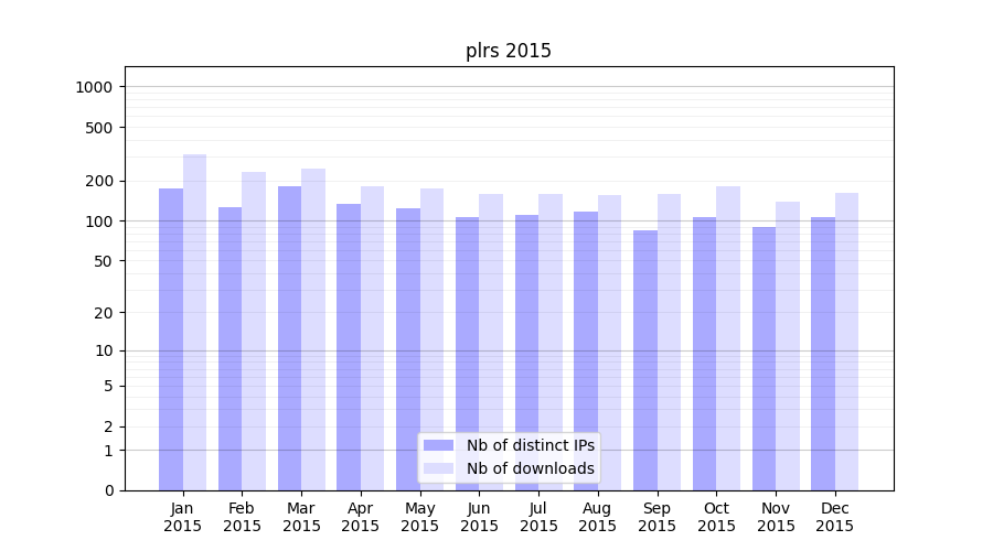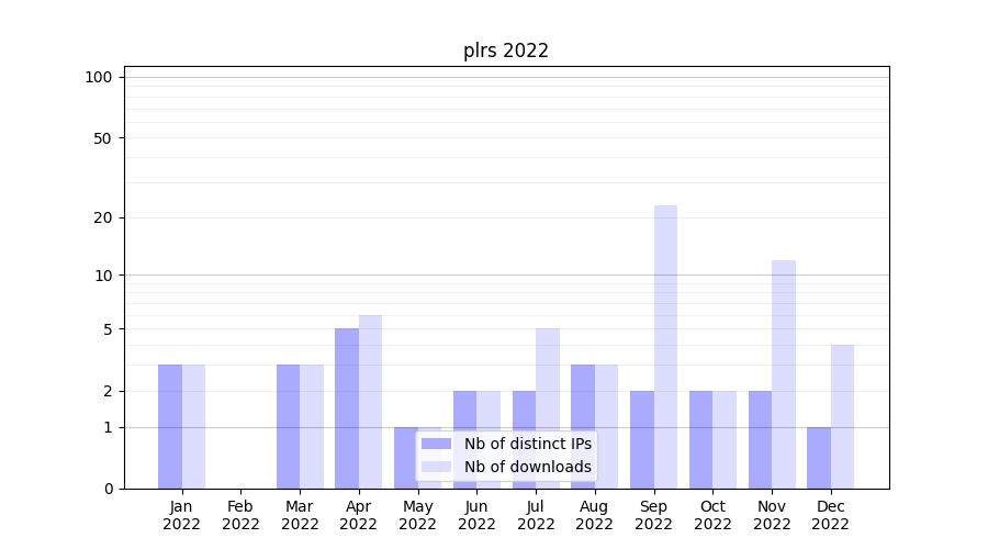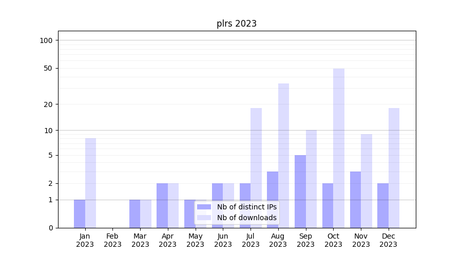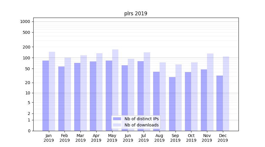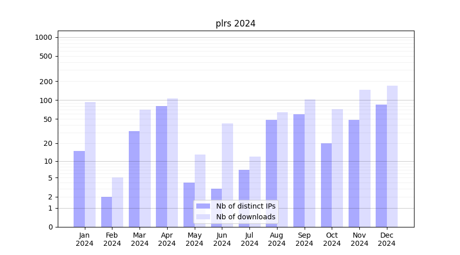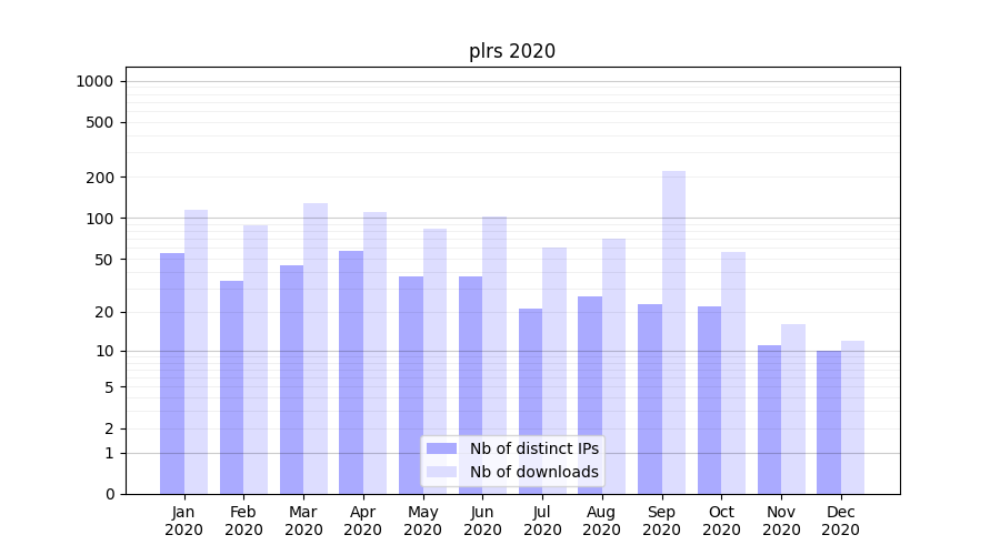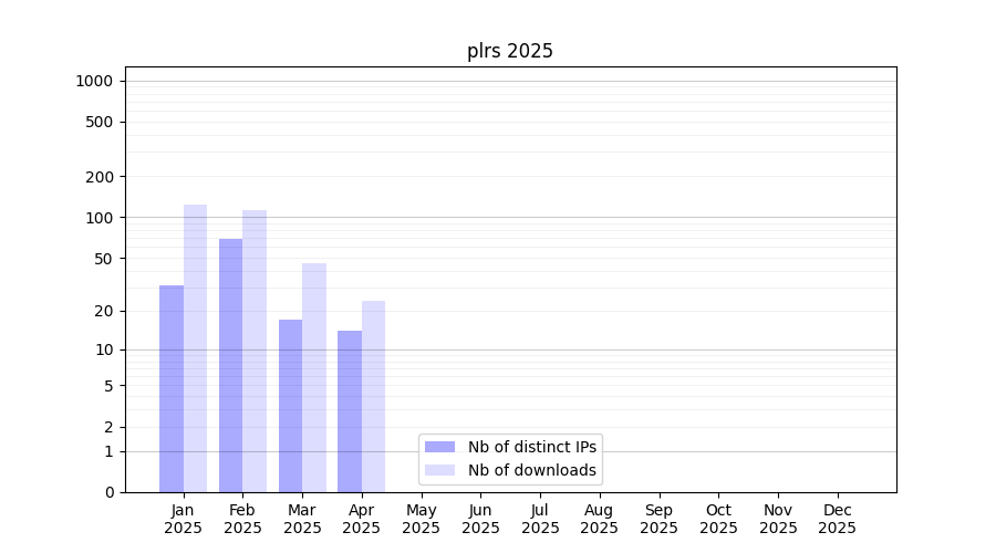 Number of downloads for software package plrs, year by year, from 2025 back to 2014 (years with no downloads are omitted):