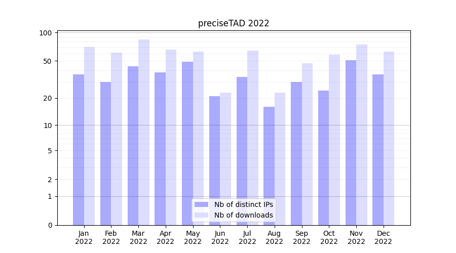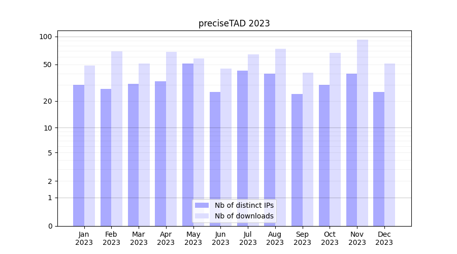 Number of downloads for software package preciseTAD, year by year, from 2025 back to 2014 (years with no downloads are omitted):