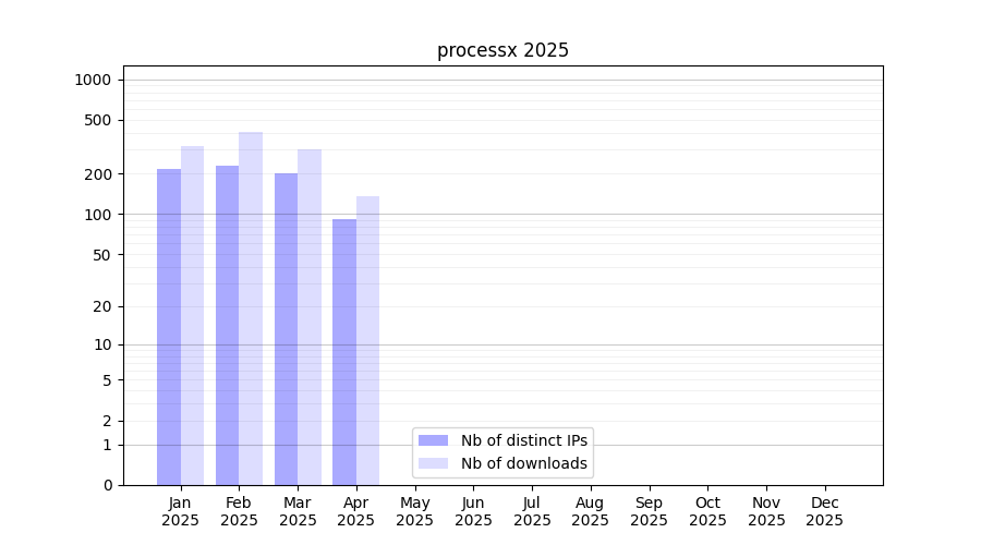 Number of downloads for software package processx, year by year, from 2025 back to 2014 (years with no downloads are omitted):