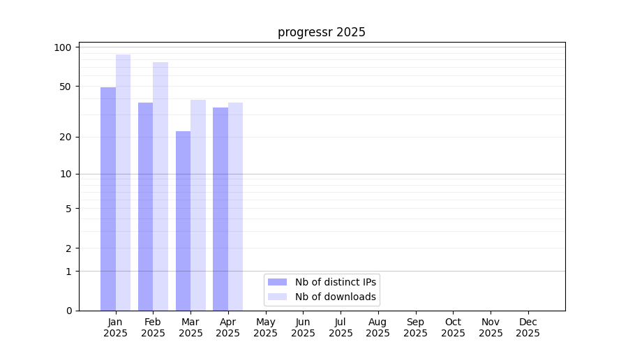Number of downloads for software package progressr, year by year, from 2025 back to 2014 (years with no downloads are omitted):