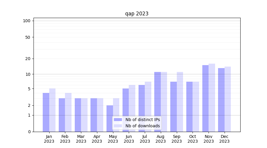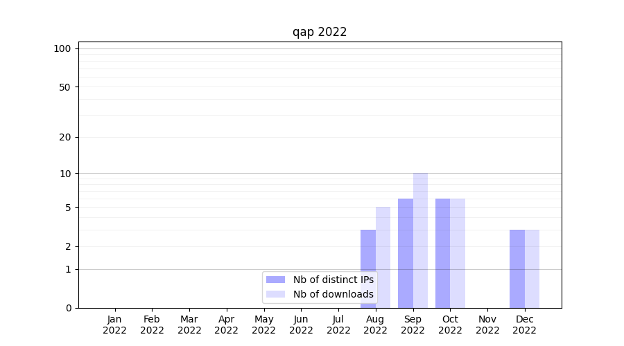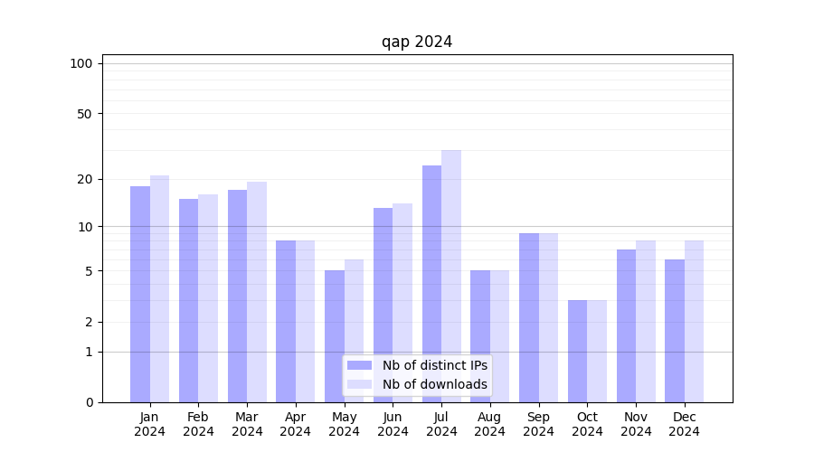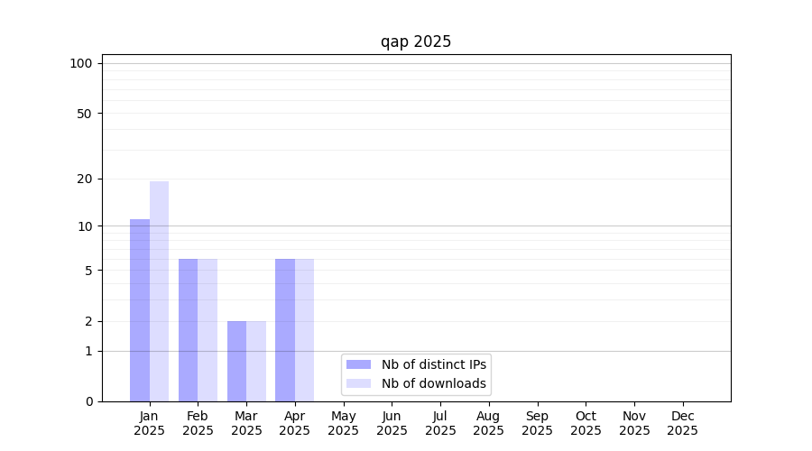 Number of downloads for software package qap, year by year, from 2025 back to 2014 (years with no downloads are omitted):