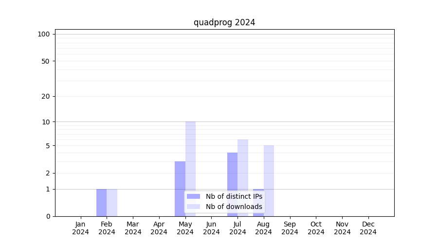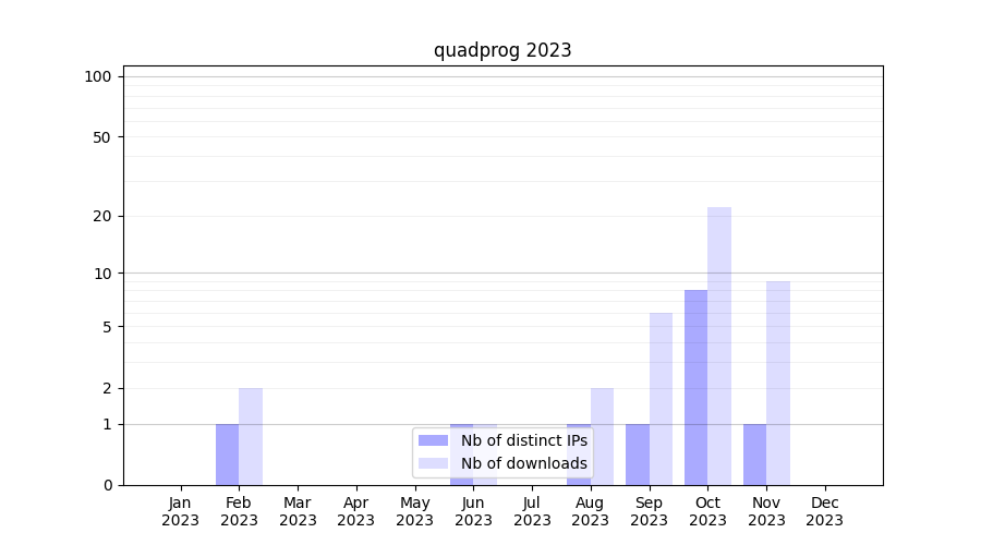 Number of downloads for software package quadprog, year by year, from 2025 back to 2014 (years with no downloads are omitted):