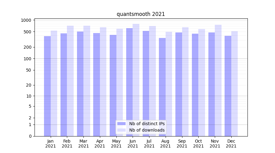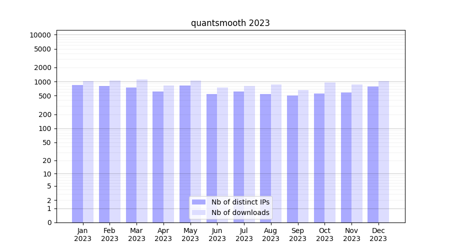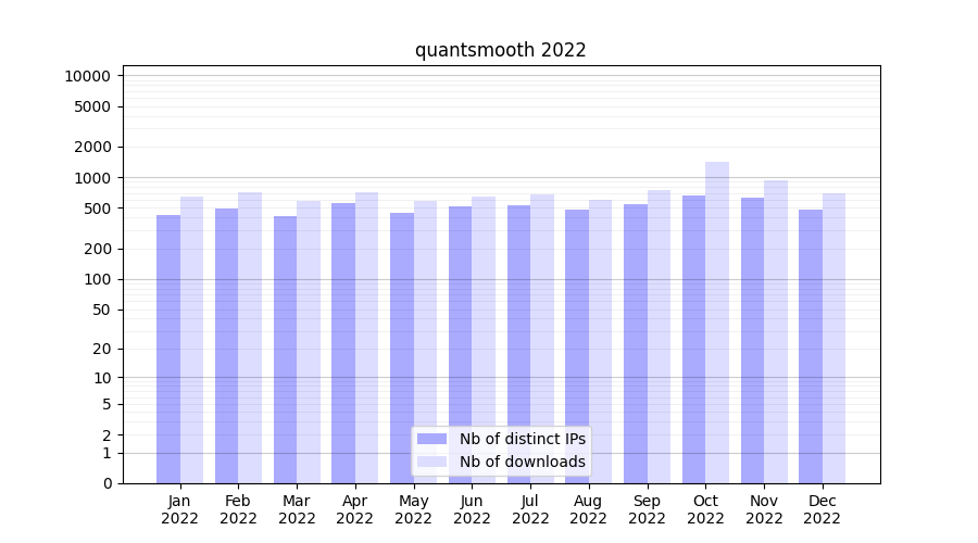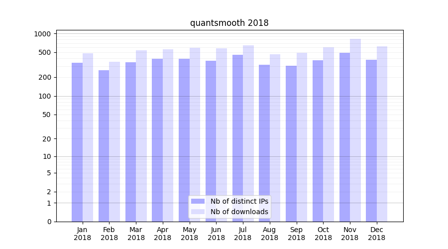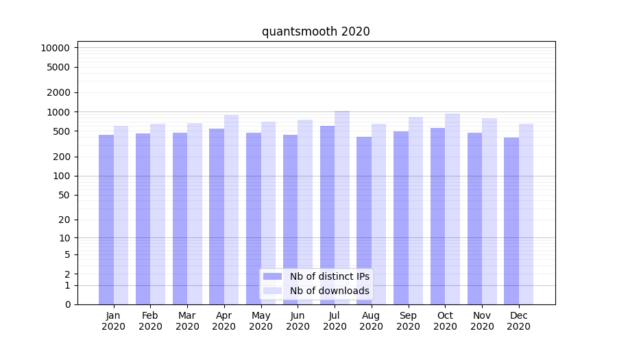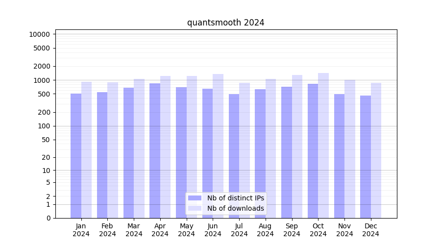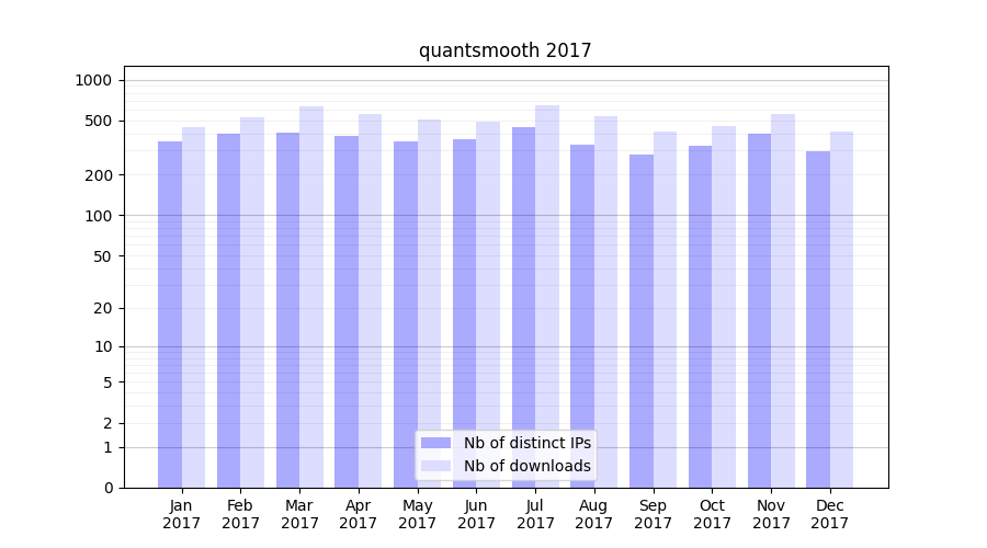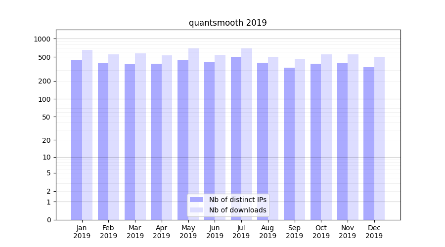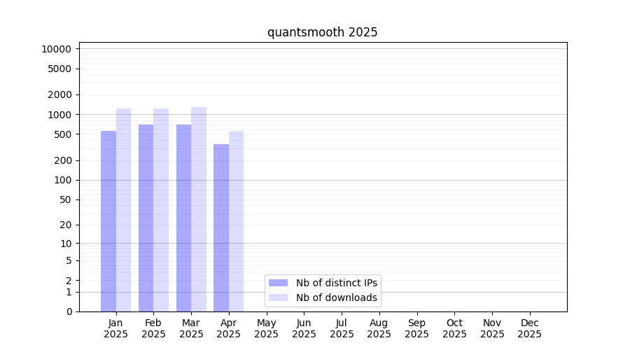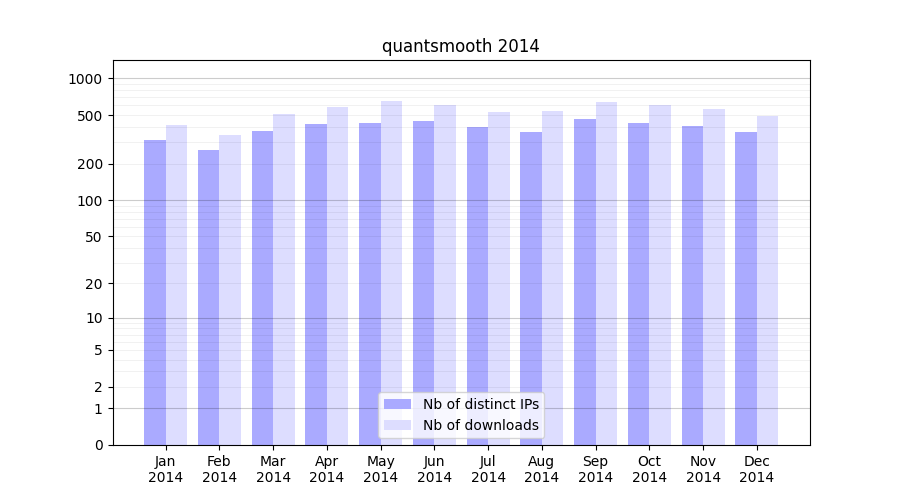 Number of downloads for software package quantsmooth, year by year, from 2025 back to 2014 (years with no downloads are omitted):