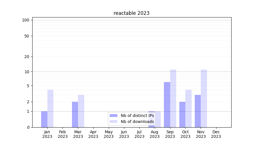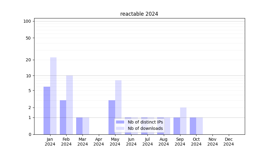 Number of downloads for software package reactable, year by year, from 2025 back to 2014 (years with no downloads are omitted):
