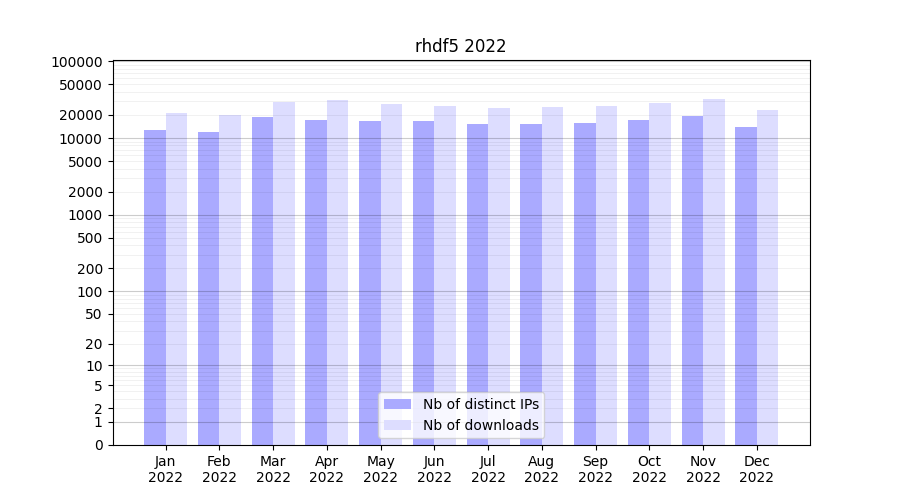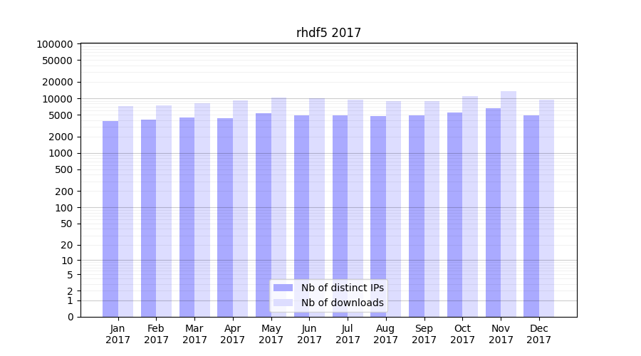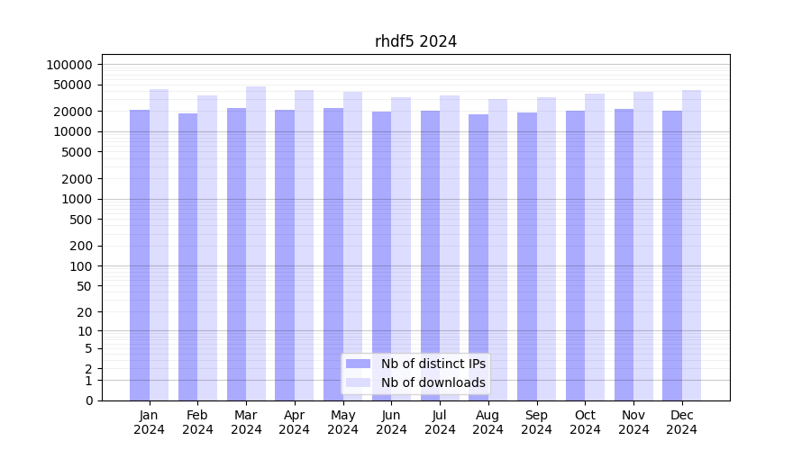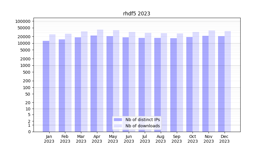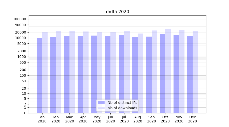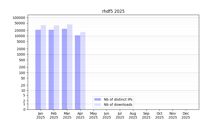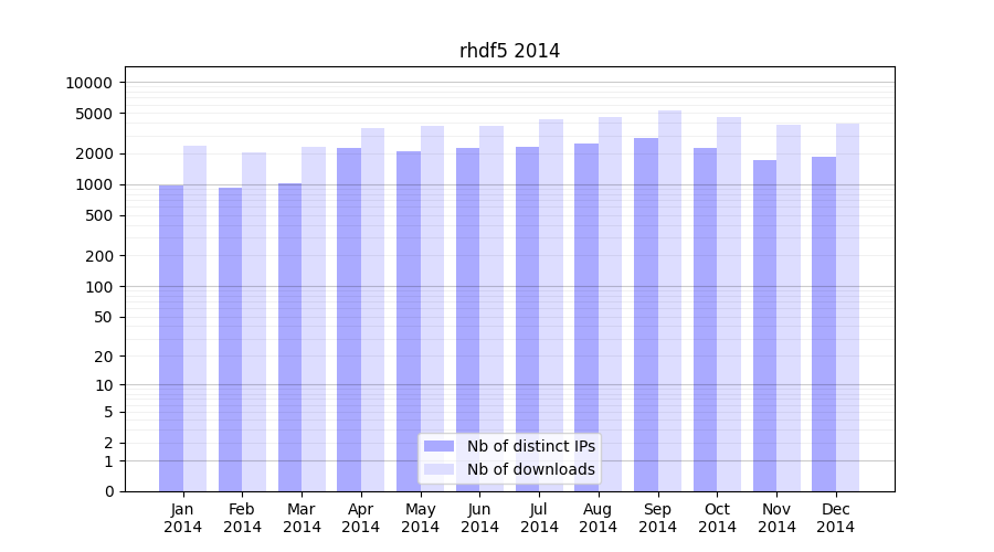Number of downloads for software package rhdf5, year by year, from 2025 back to 2014 (years with no downloads are omitted):