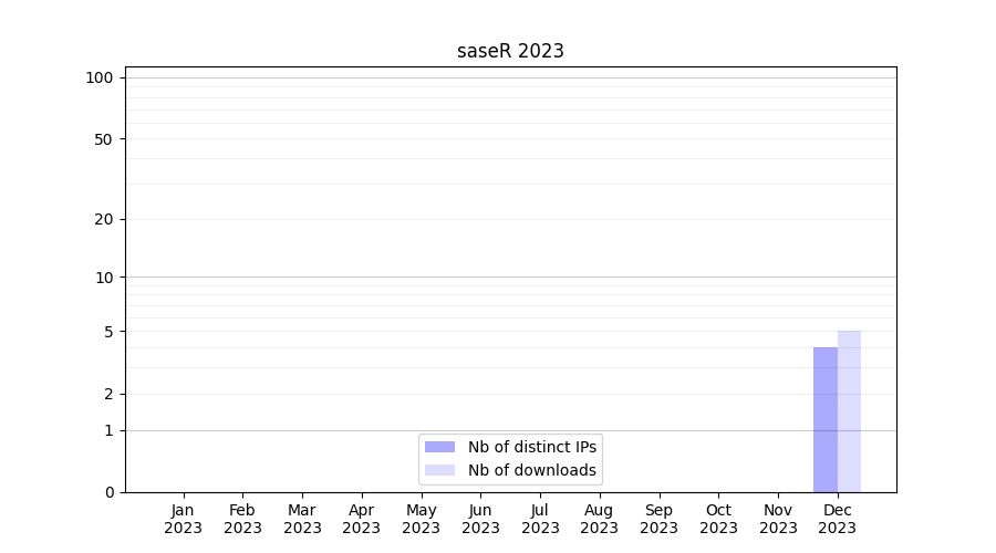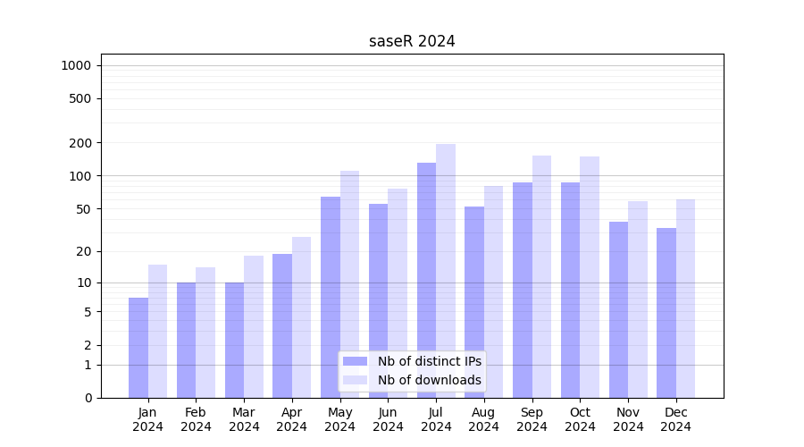 Number of downloads for software package saseR, year by year, from 2025 back to 2014 (years with no downloads are omitted):