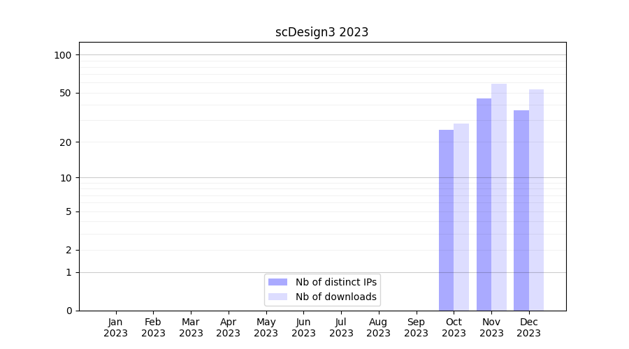 Number of downloads for software package scDesign3, year by year, from 2025 back to 2014 (years with no downloads are omitted):