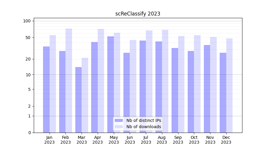 Number of downloads for software package scReClassify, year by year, from 2025 back to 2014 (years with no downloads are omitted):