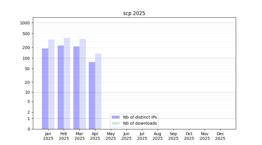 Number of downloads for software package scp, year by year, from 2025 back to 2014 (years with no downloads are omitted):