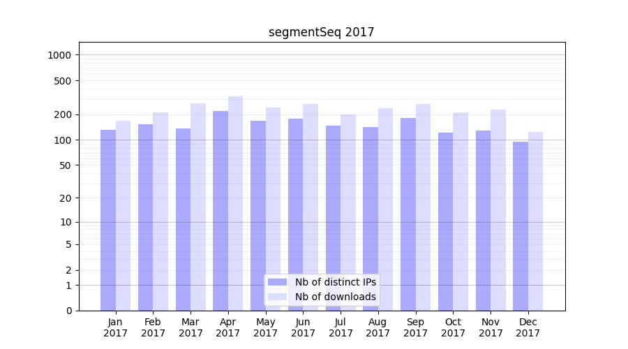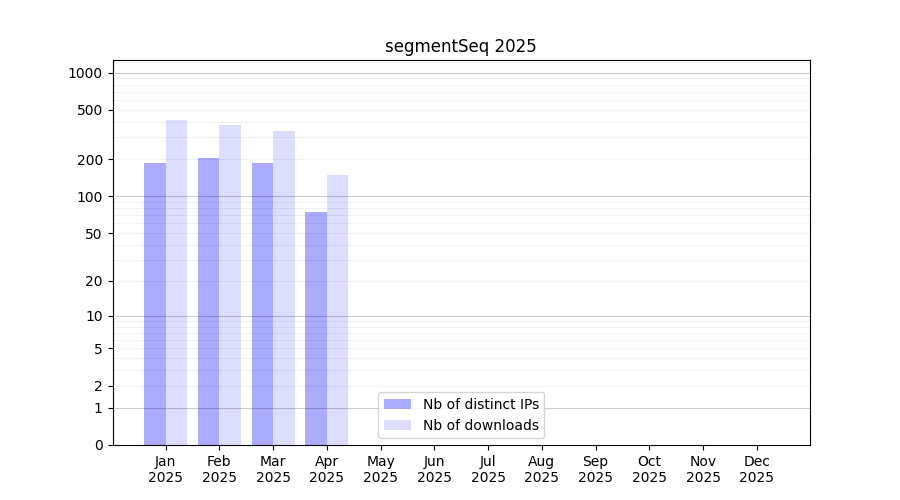 Number of downloads for software package segmentSeq, year by year, from 2025 back to 2014 (years with no downloads are omitted):