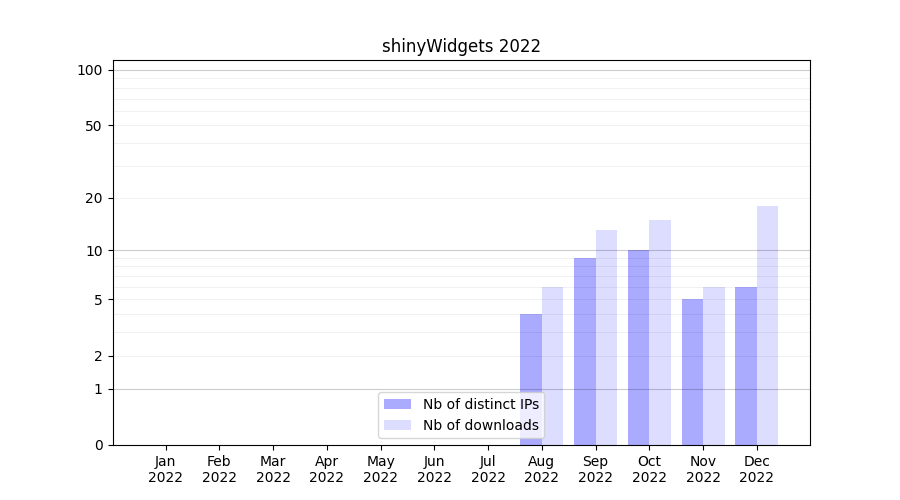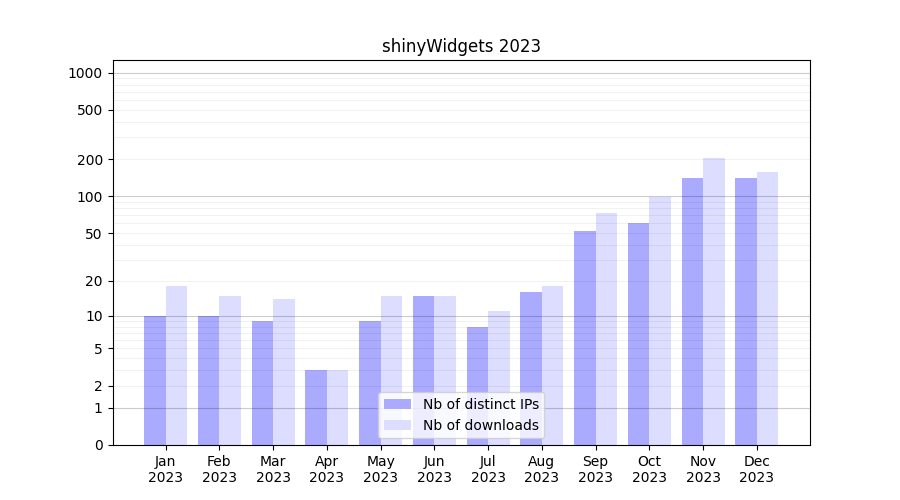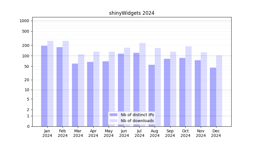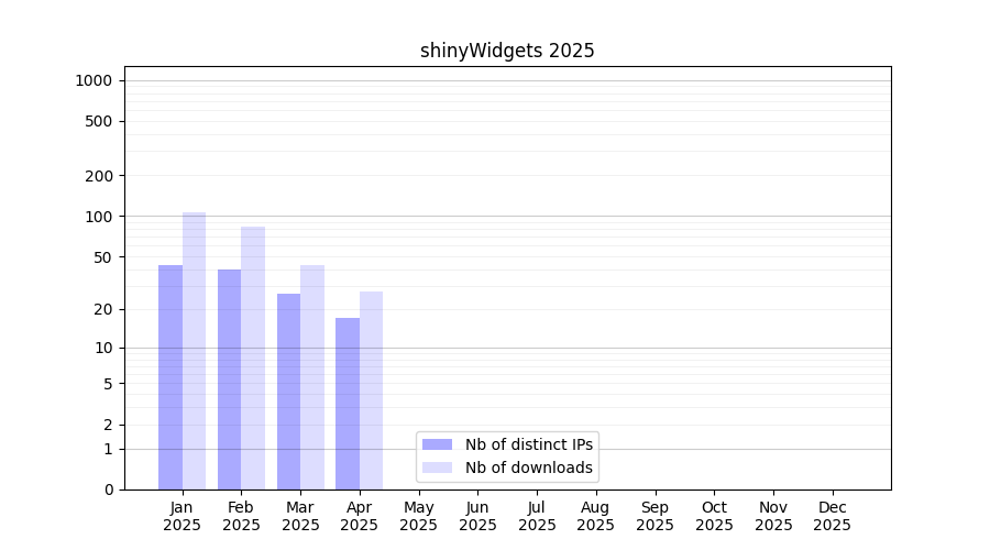 Number of downloads for software package shinyWidgets, year by year, from 2025 back to 2014 (years with no downloads are omitted):