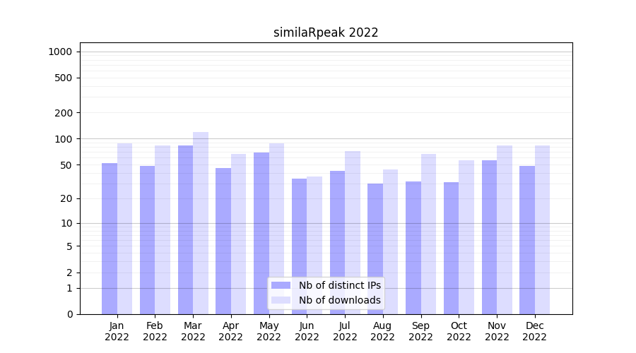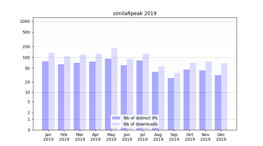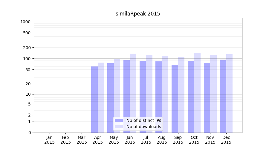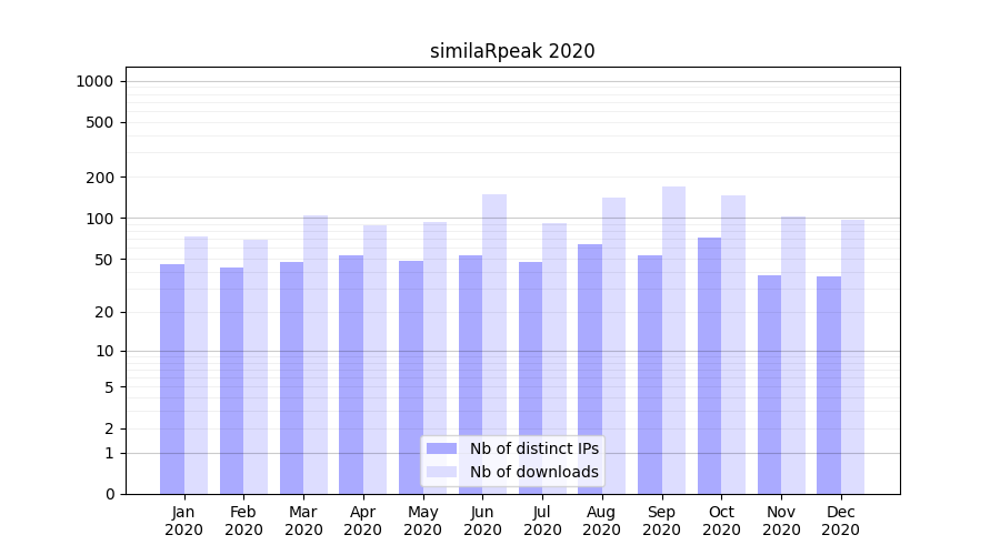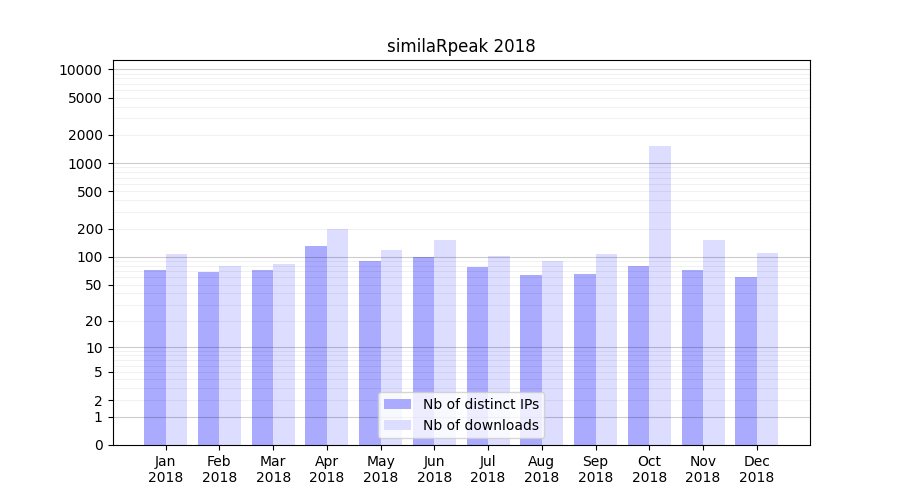 Number of downloads for software package similaRpeak, year by year, from 2025 back to 2014 (years with no downloads are omitted):