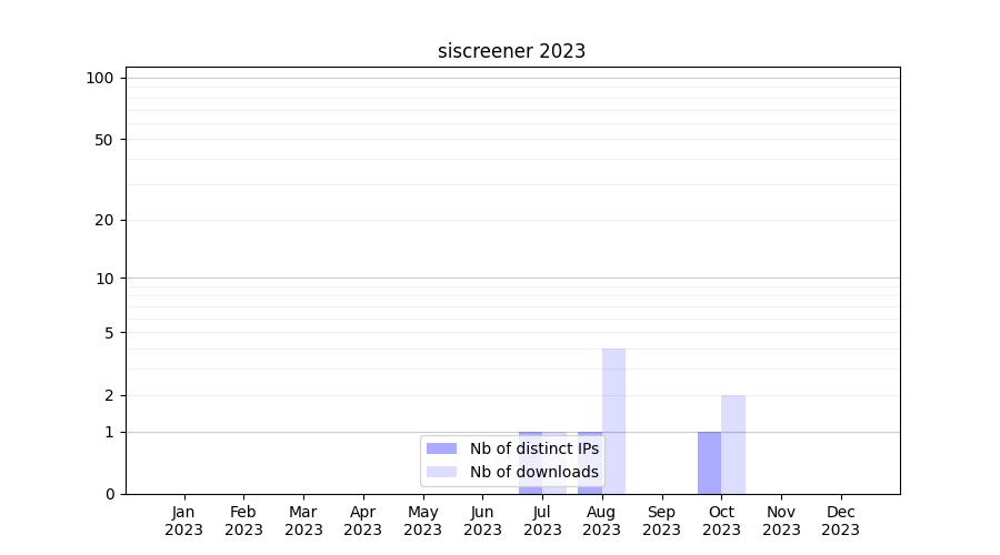 Number of downloads for software package siscreener, year by year, from 2025 back to 2014 (years with no downloads are omitted):