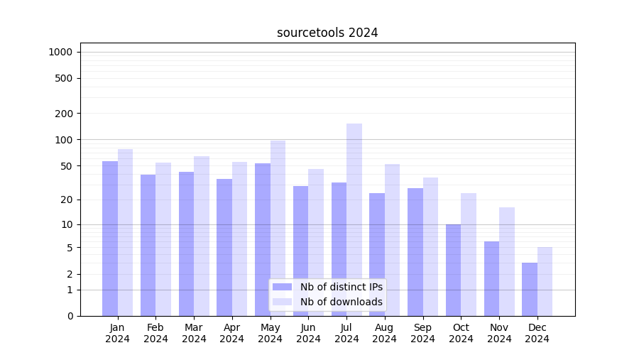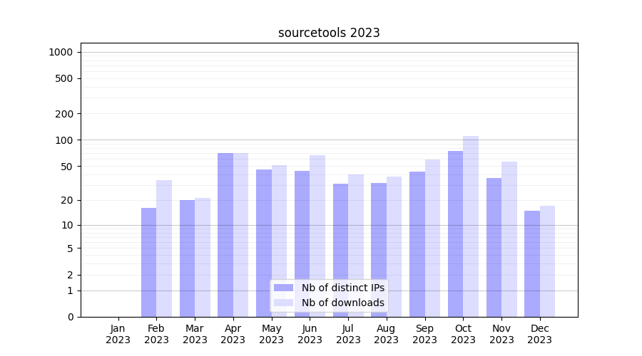 Number of downloads for software package sourcetools, year by year, from 2025 back to 2014 (years with no downloads are omitted):