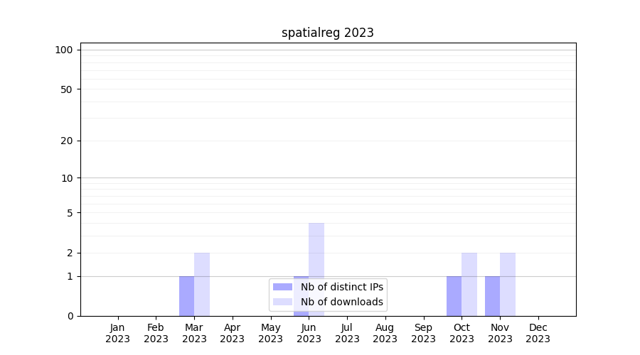 Number of downloads for software package spatialreg, year by year, from 2025 back to 2014 (years with no downloads are omitted):