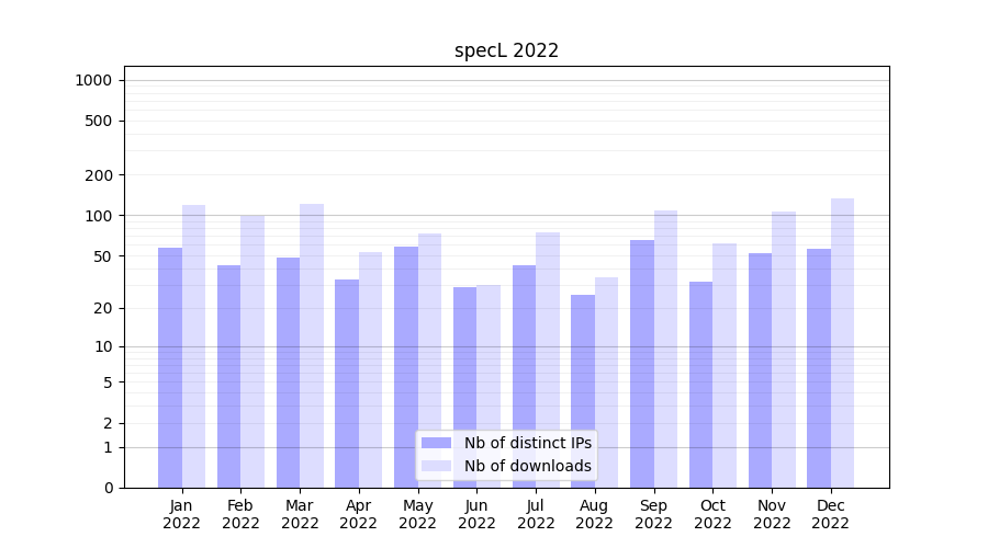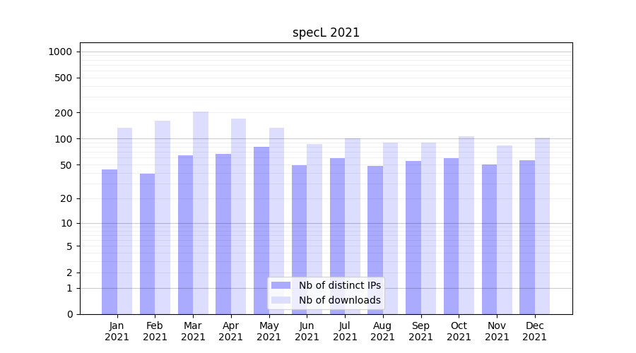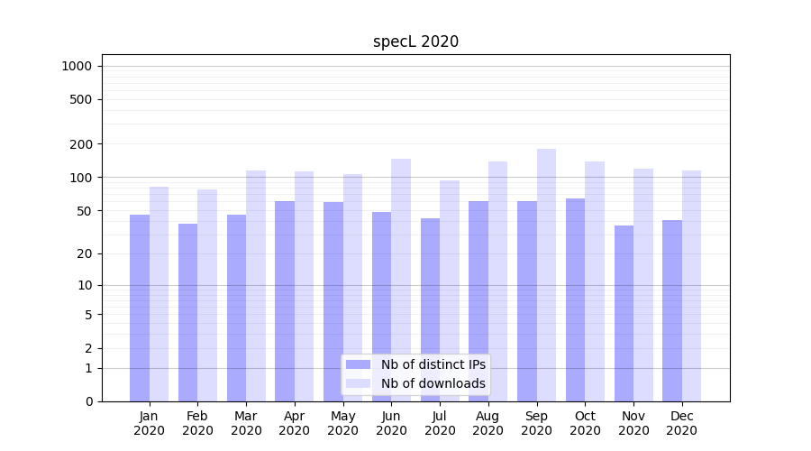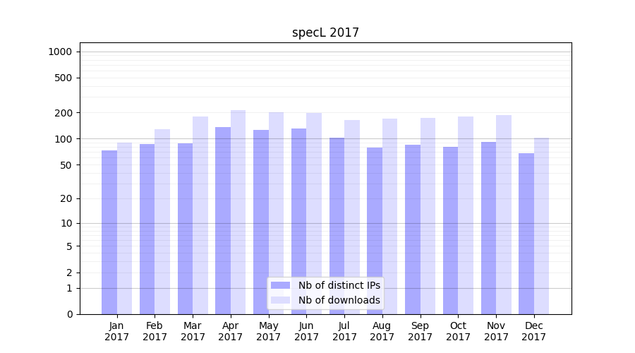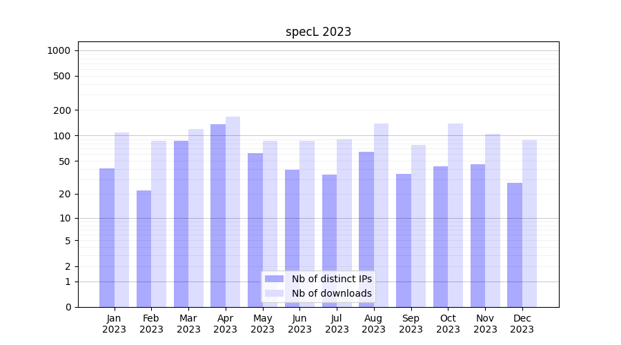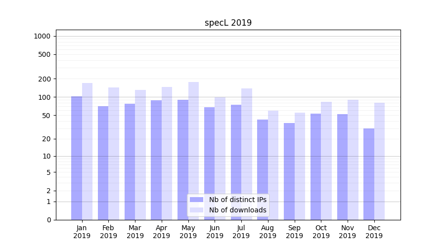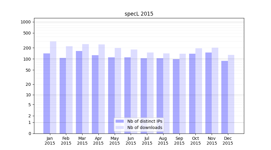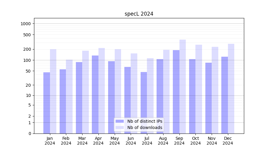 Number of downloads for software package specL, year by year, from 2025 back to 2014 (years with no downloads are omitted):