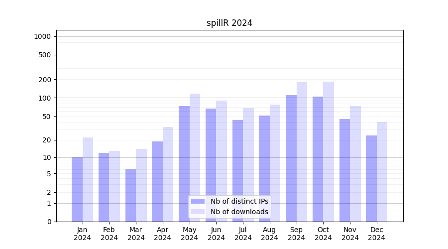 Number of downloads for software package spillR, year by year, from 2025 back to 2014 (years with no downloads are omitted):