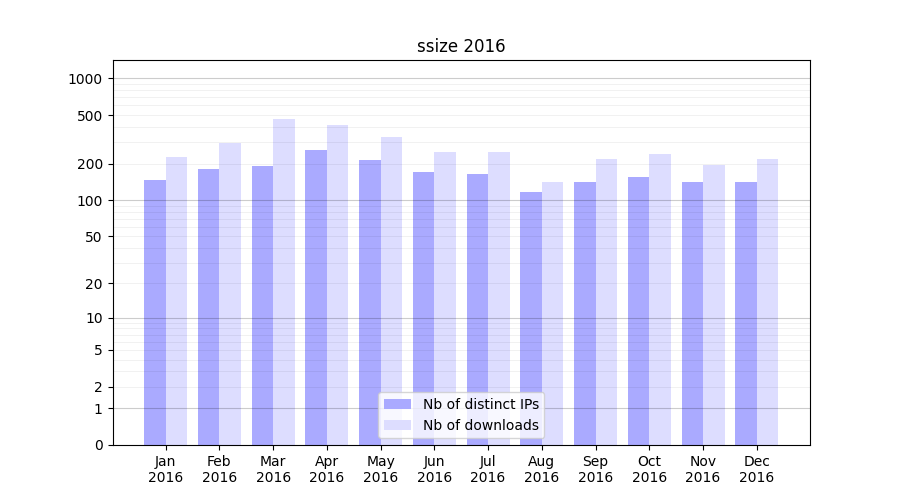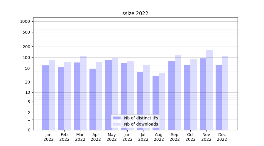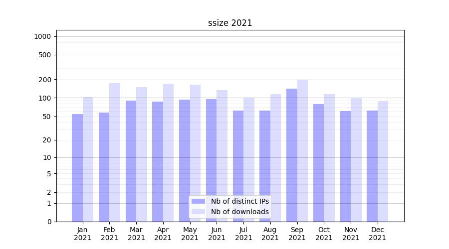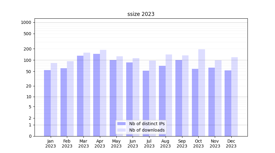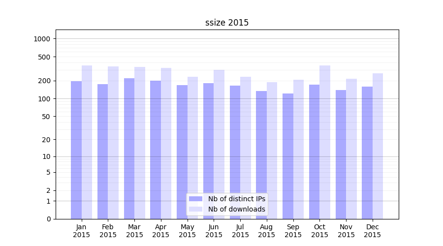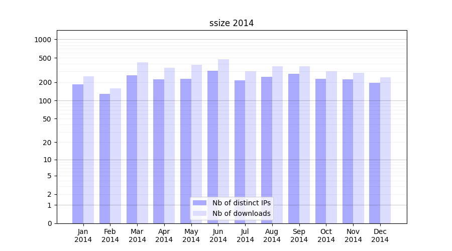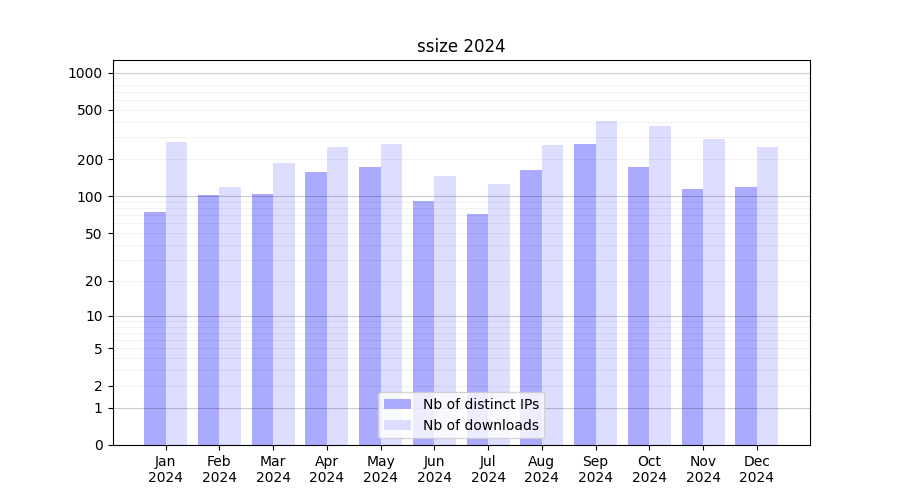 Number of downloads for software package ssize, year by year, from 2025 back to 2014 (years with no downloads are omitted):